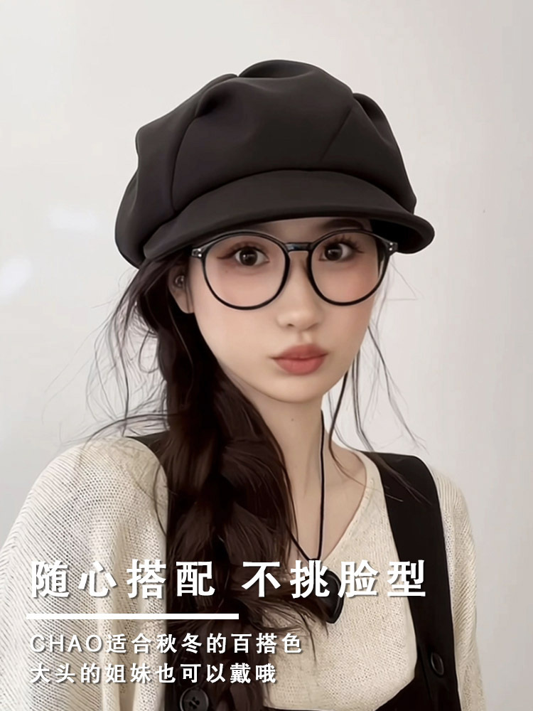 复古褶皱黑色贝雷帽女秋冬季显脸小八角帽大头围韩系报童画家帽子