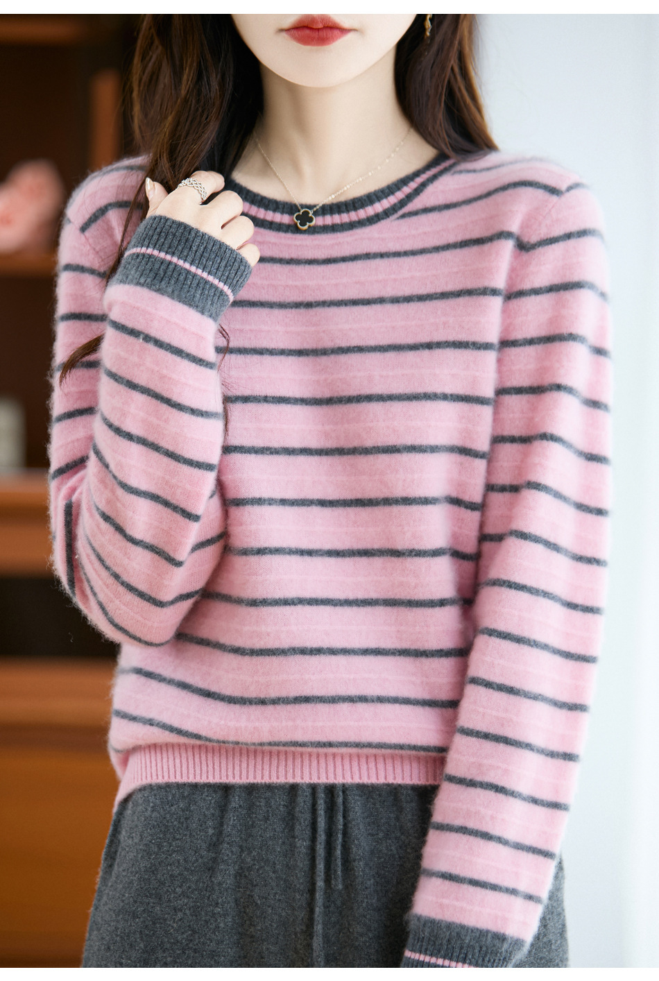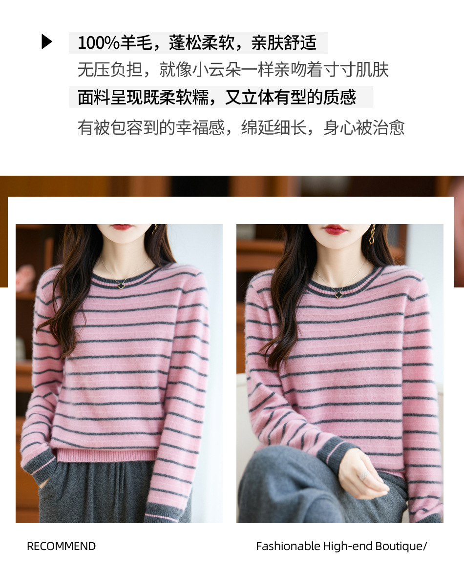 100%纯羊毛2025秋冬新款女式宽松圆领拼色短款上衣打底针织衫毛衣