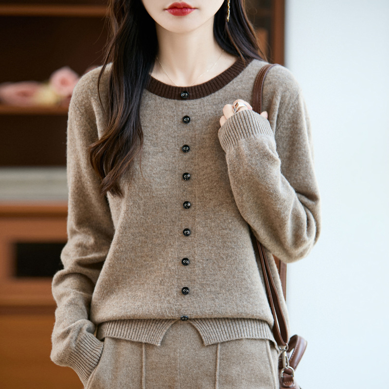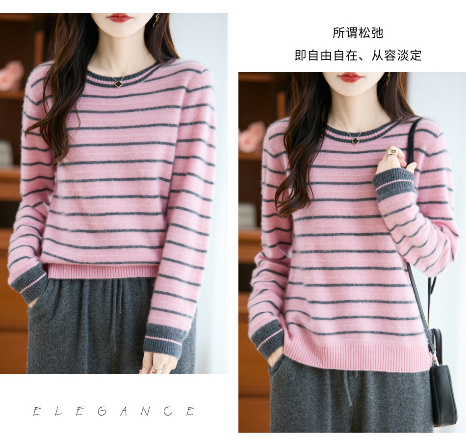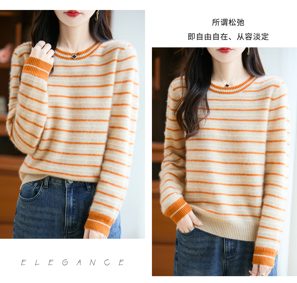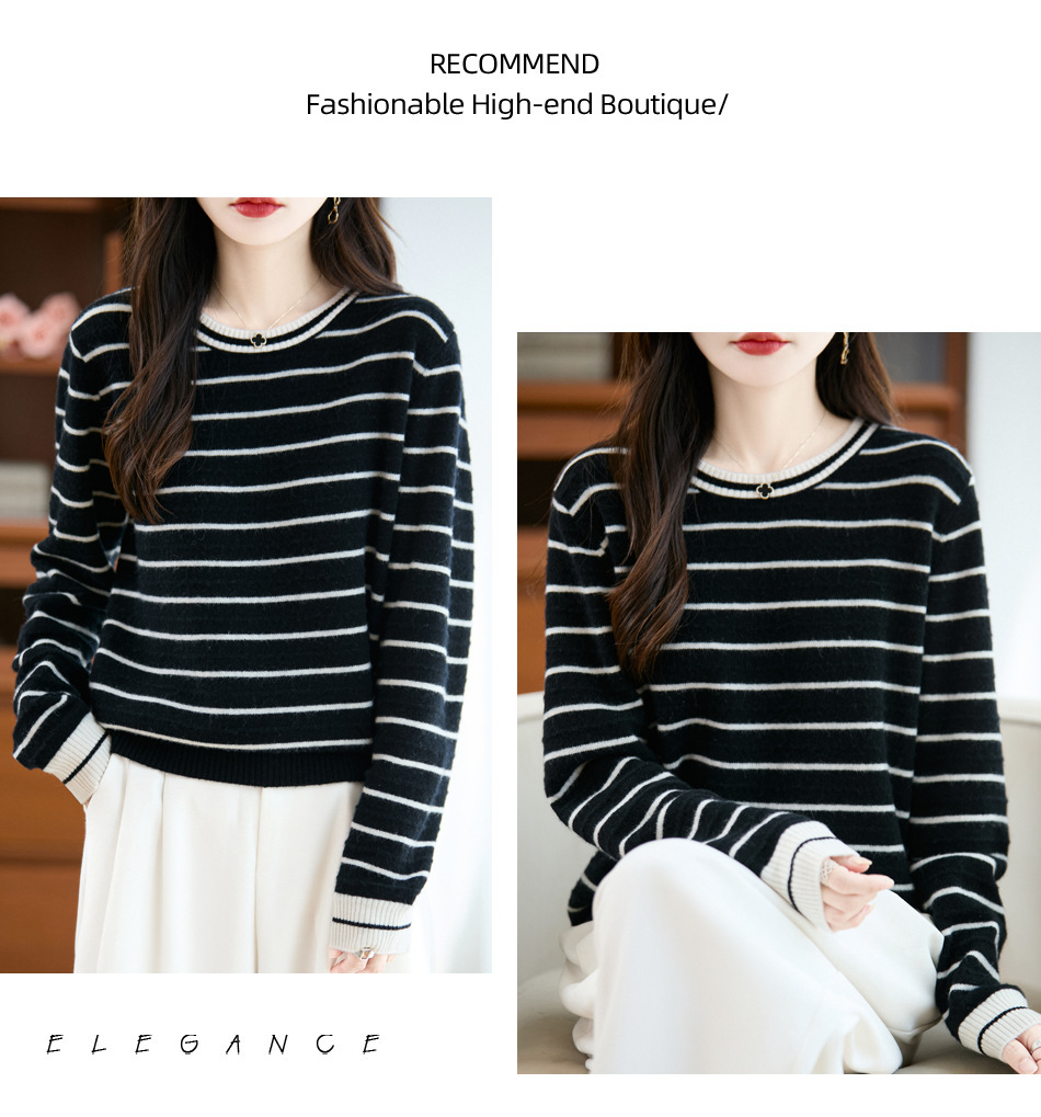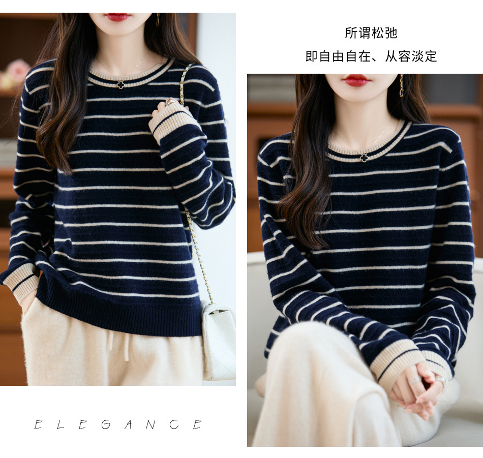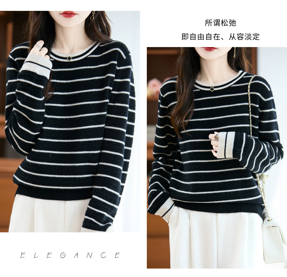 100%纯羊毛2025秋冬新款女式宽松圆领撞色短款套头上衣打底针织衫