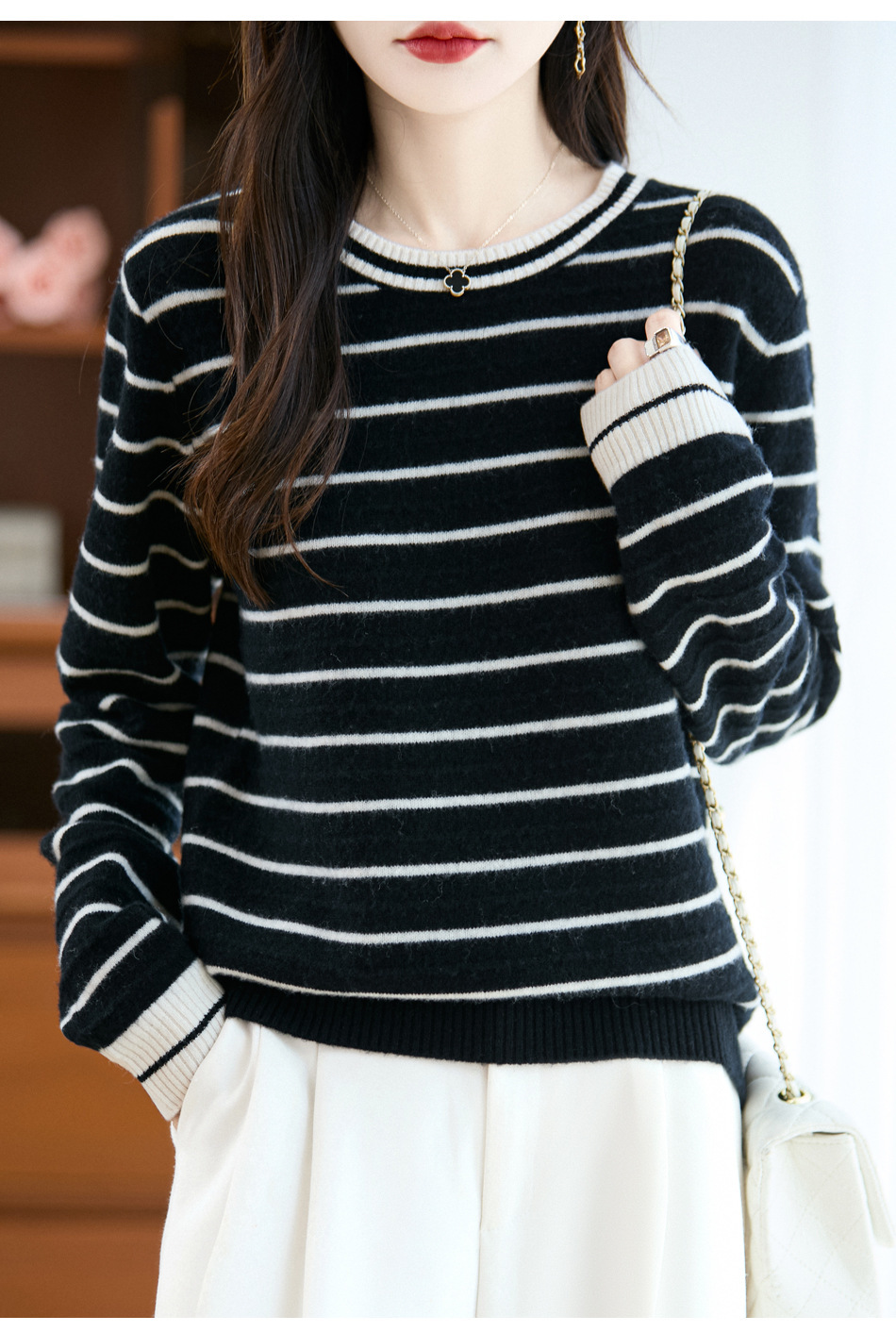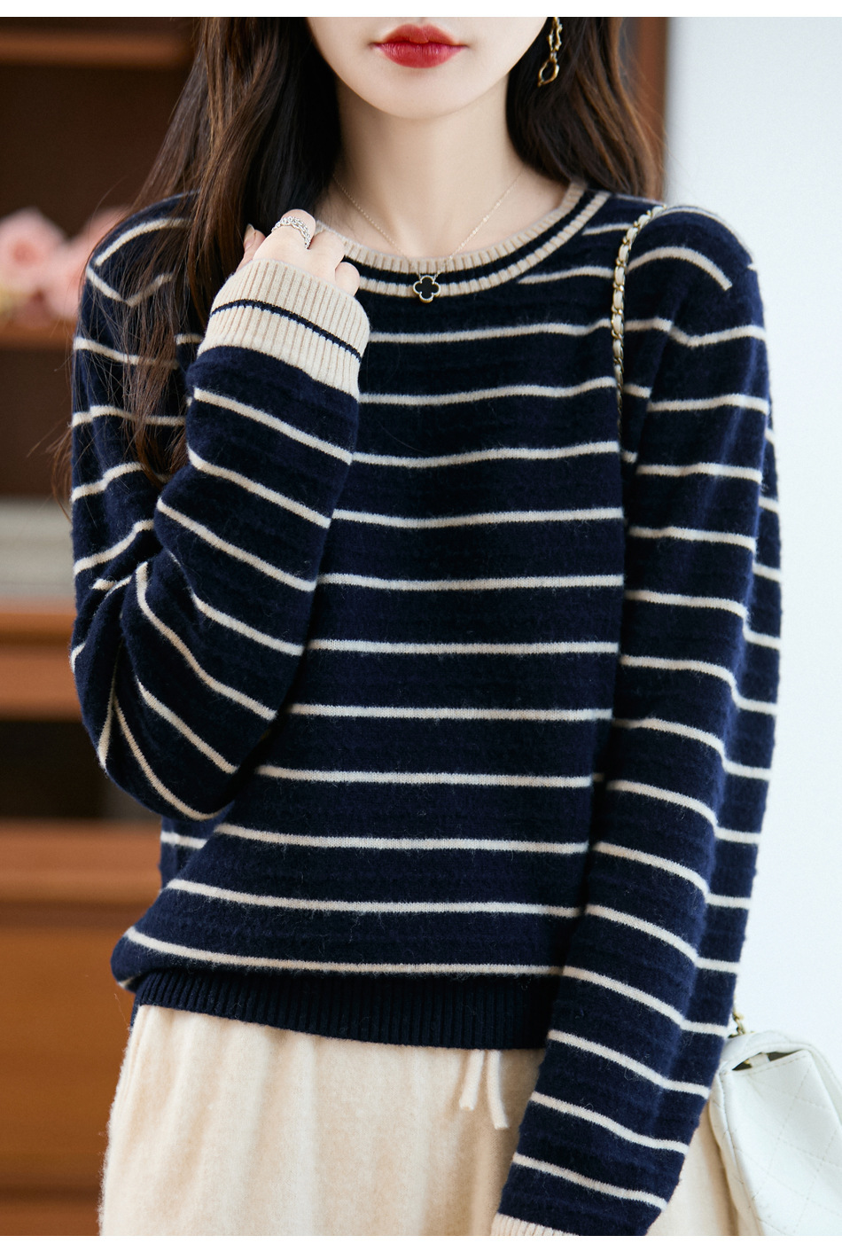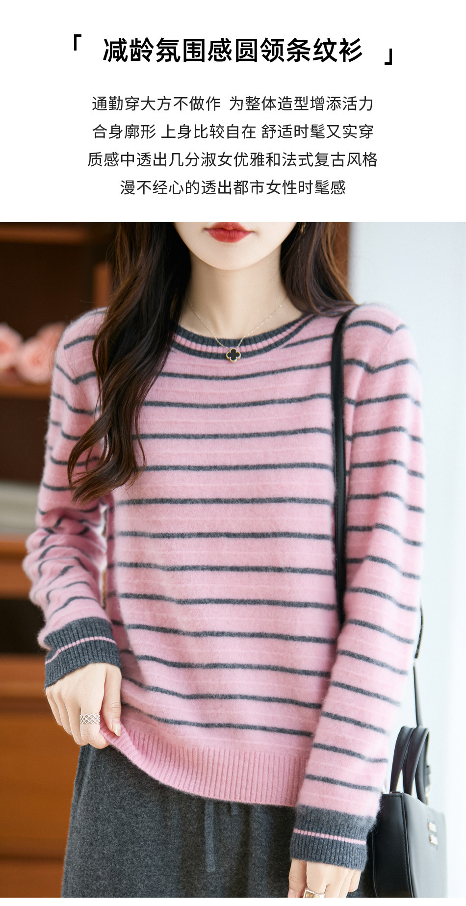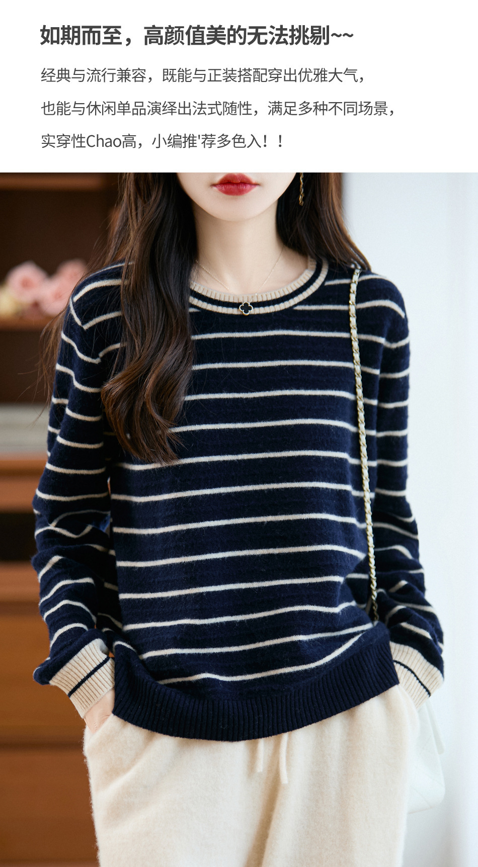 100%纯羊毛2025秋冬新款女式宽松圆领撞色短款套头上衣打底针织衫