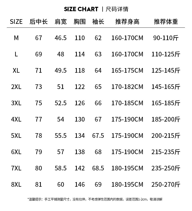 尺码 M,L,XL,2XL,3XL,4XL,5XL,6XL,7XL,8XL