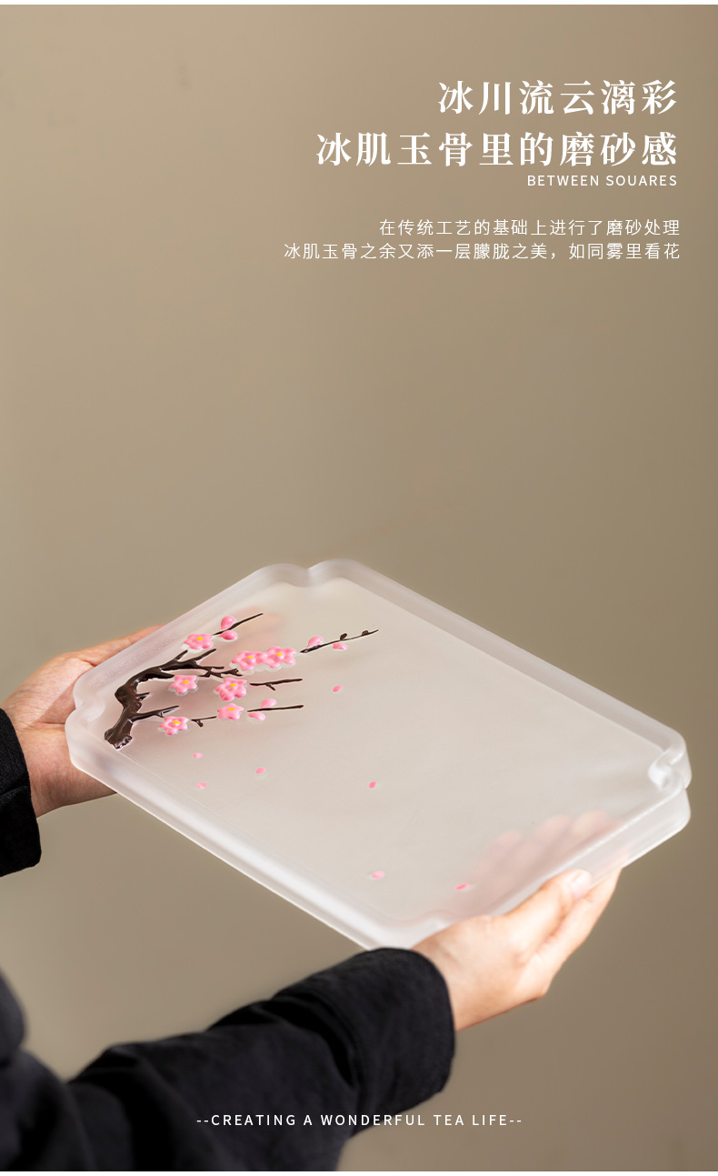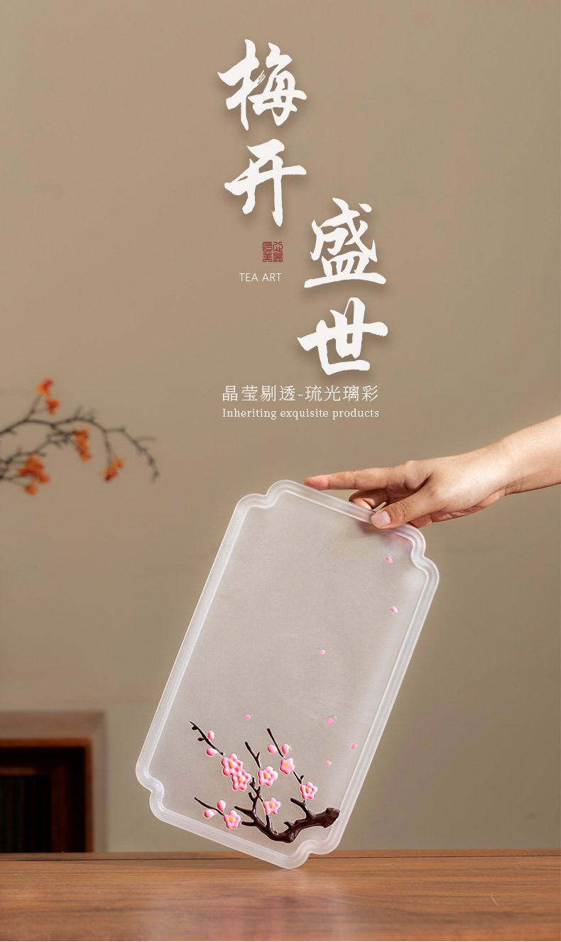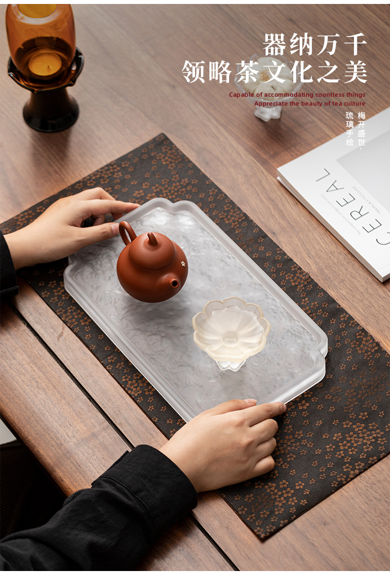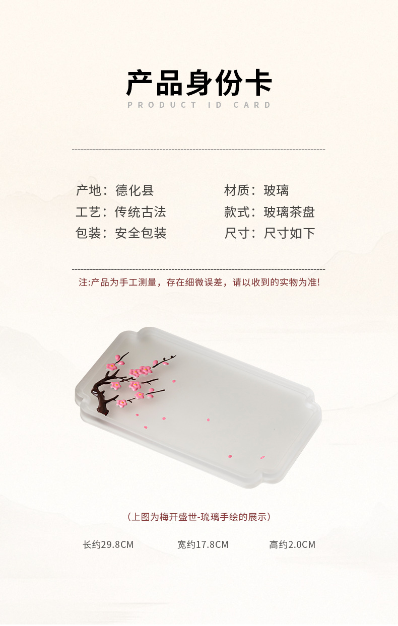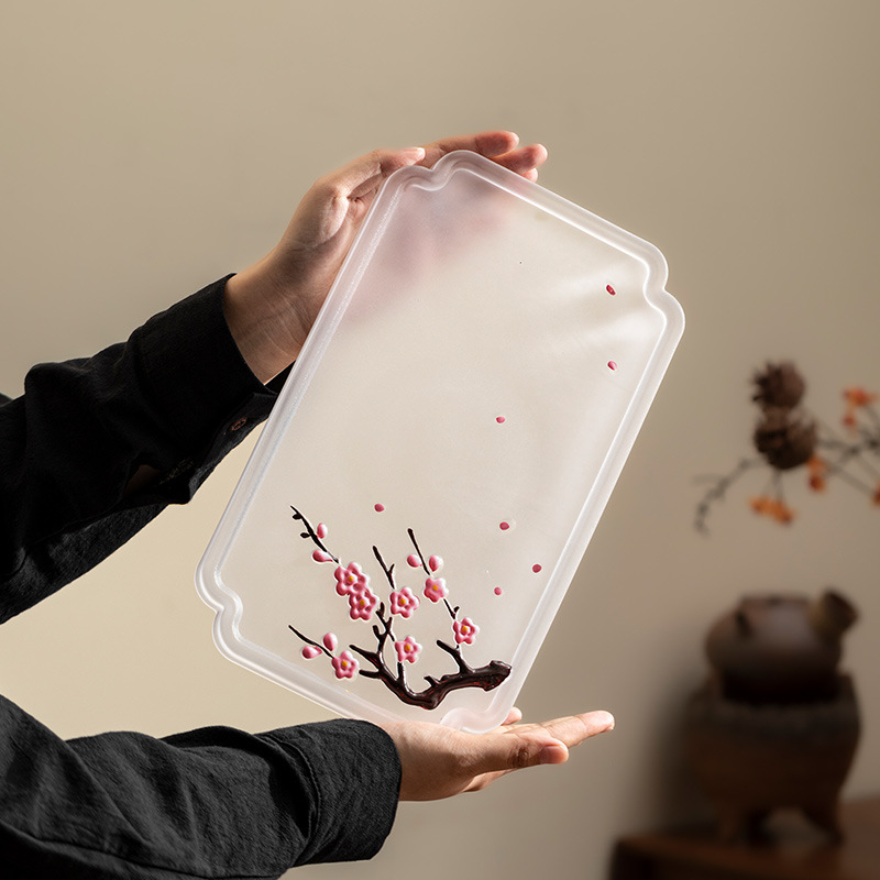 流云璃彩手绘梅花玻璃茶盘家用小型干泡盘中式简约茶台茶具隔热盘