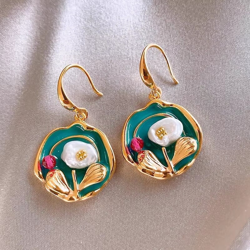モネ花園油絵風花真珠イヤリングファッション気質ピアス宮廷風軽豪華レトロ文芸耳飾り