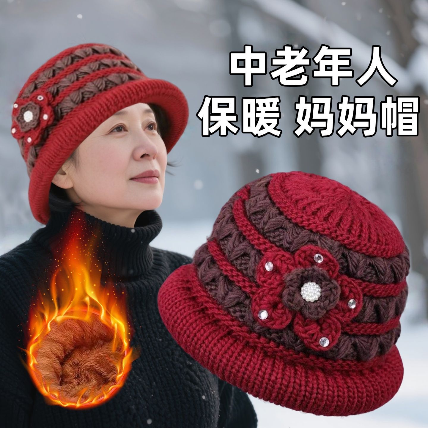 高齢者向けの秋冬ニット帽、ベルベットの厚みのある暖かいマザーズハット、中高年女性向けのウールの盆地帽子