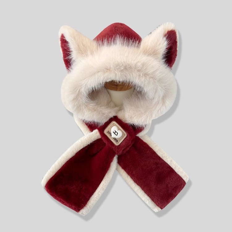 冬用女性用ぬいぐるみ帽子、キツネの耳が付いた可愛いスカーフ一体型帽子、裏起毛で暖かく防風、アウトドアサイクリング用帽子