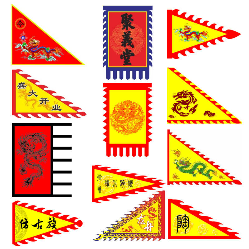 アンティーク風旗、三角旗、龍旗、鳳凰旗、姓旗、両面旗、景勝地旗、龍舟旗、三角旗の特注製作