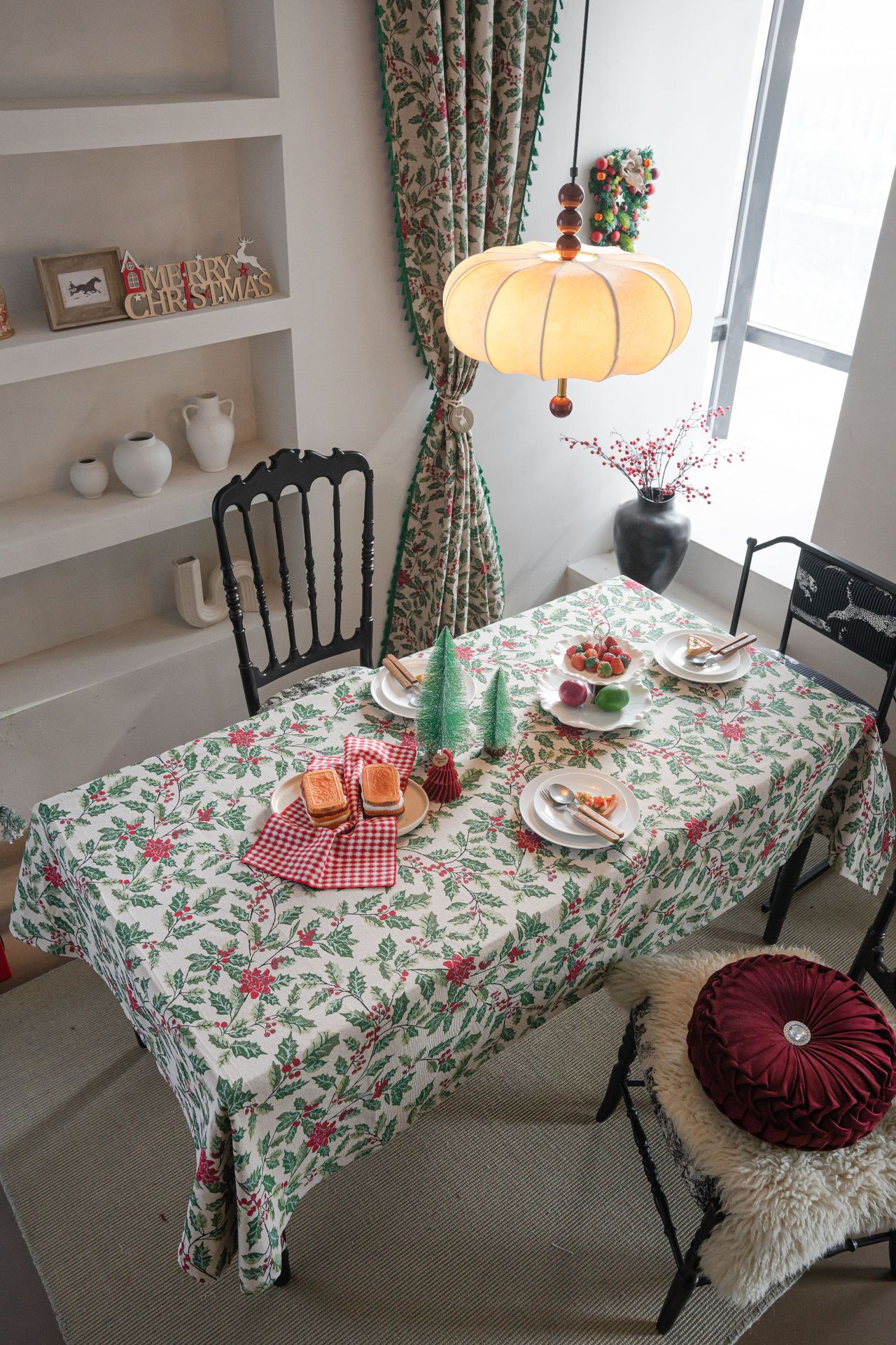 伊缦琪韵圣诞冬青叶烫金桌布浆果印花节日餐桌布盖布茶几长方形