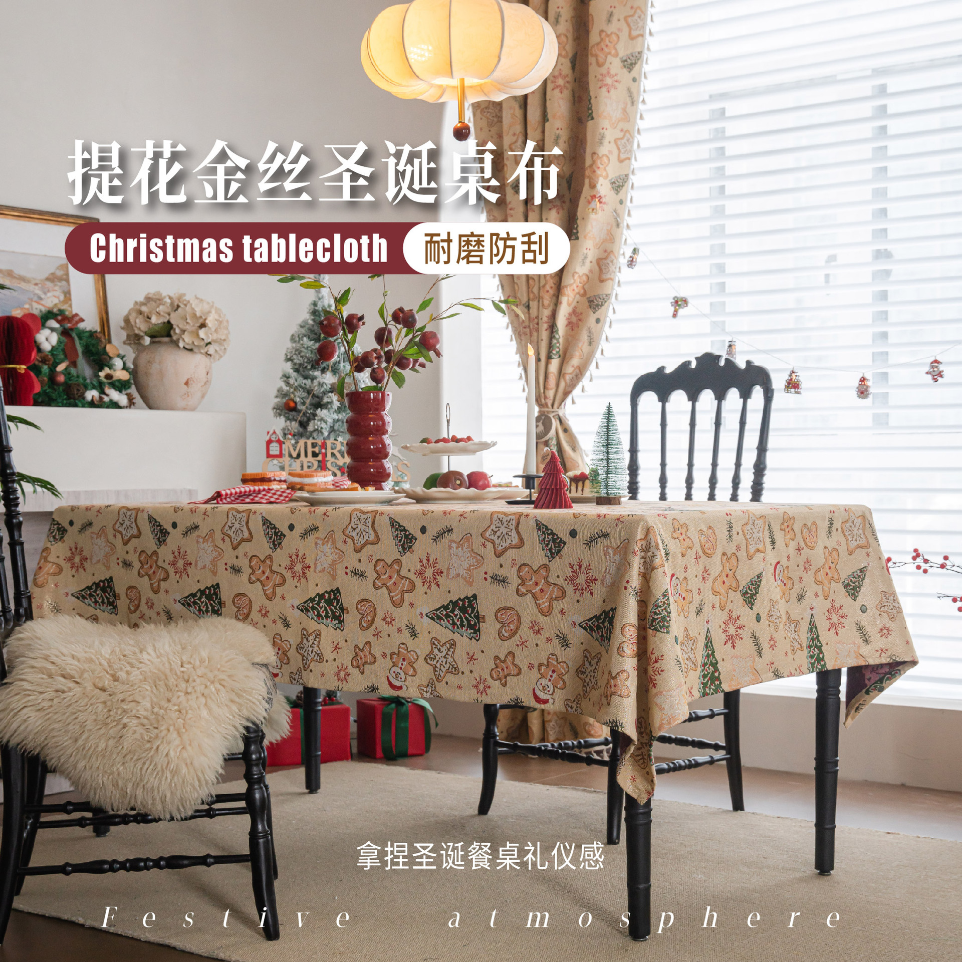伊缦琪韵提花桌布姜饼人圣诞撞色方块几何餐桌布长方形工厂直供