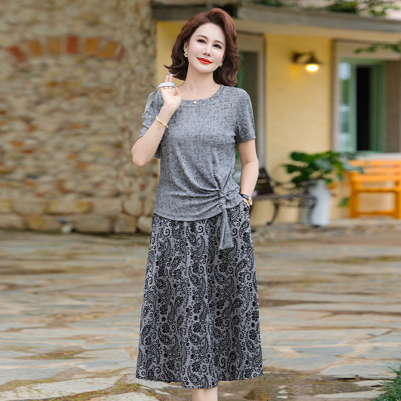 中高年ママ向けの夏の洋風スーツ、新作半袖トップス、おしゃれなプリントスカート、年齢軽減ツーピーススーツ