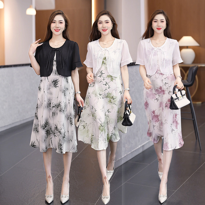 気質中高年ママドレス偽ツーピース夏の新しいファッションスタイル半袖スリム花柄ドレス