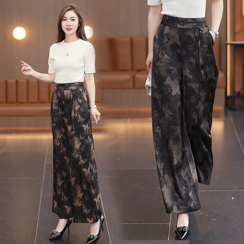 レトロプリントサテンワイドレッグパンツ女性の夏の薄いデザインファッショナブルなハイウエストカジュアルストレートパンツ