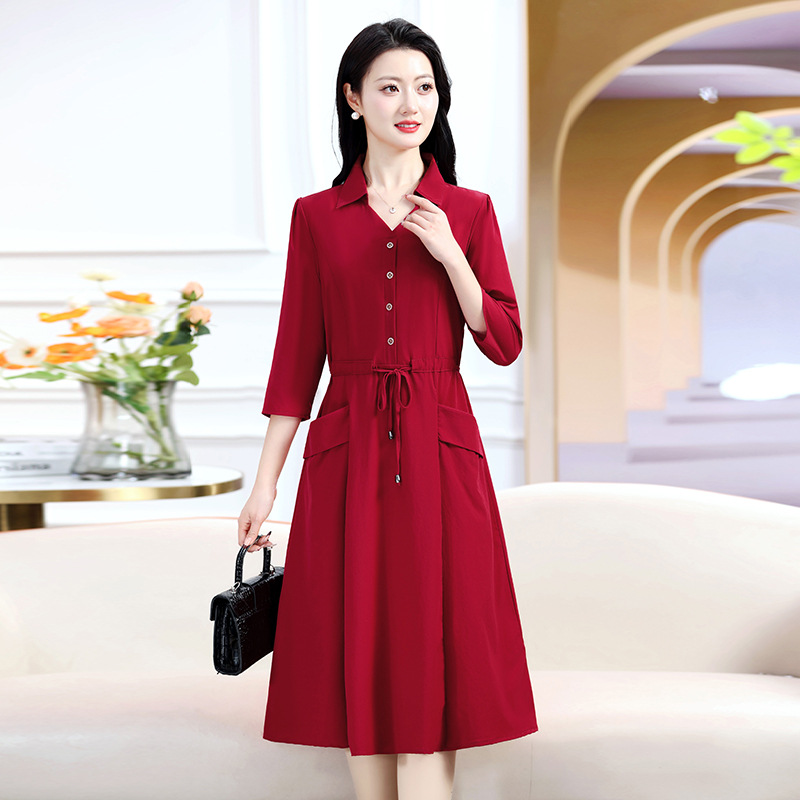 春と秋の新作中高年女性の七分袖ドレスファッショナブルなママミドル丈ラペルウエストミドル丈スカート