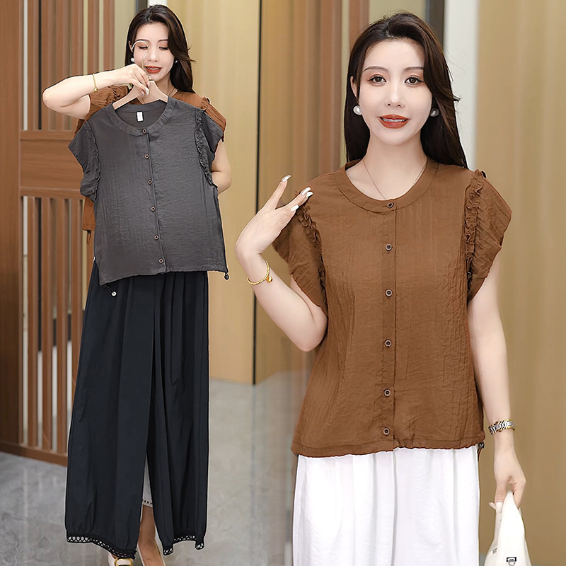 夏の新しいファッション中高年母親のフレンチシャツ多用途ラウンドネック半袖痩身と年齢を軽減する西洋スタイルのシャツ