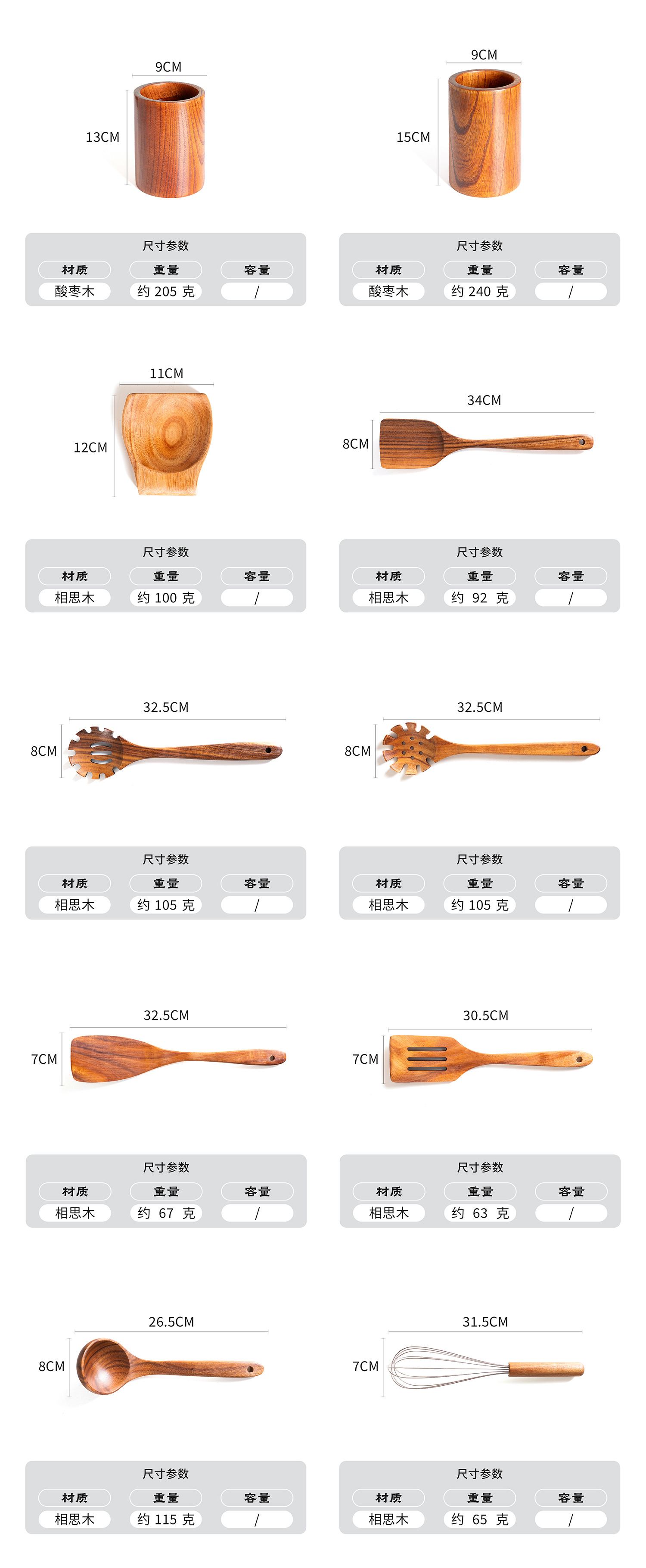 尺寸 短柄饭勺,长柄饭勺,锅铲,炒铲,三线铲,汤勺,漏勺,沙拉勺,沙拉叉,小汤勺,三线捞面勺,七孔捞面勺,搁勺器,大漆面包夹,相思木打蛋器,酸枣木13CM沥水桶,酸枣木15CM沥水桶,柚木4件套,柚木5件套,柚木6件套(13Cm桶),柚木7件套,柚木9件套(15CM桶),柚木10件套,柚木12件套