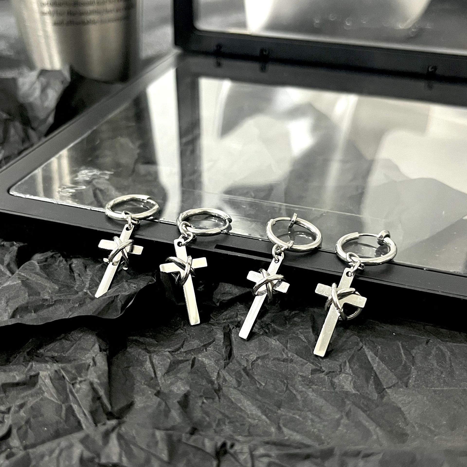新款缠绕十字架耳环男钛钢耳饰耳扣女小众设计感耳夹配饰高级感