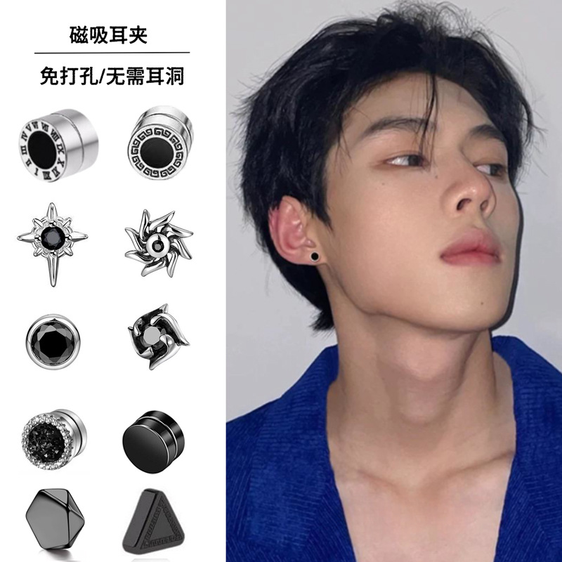 ひし形磁気耳吸い込みピアス耳穴なし鉄石ピアス男性潮個性シングル耳飾り穴なしヒップホップピアス