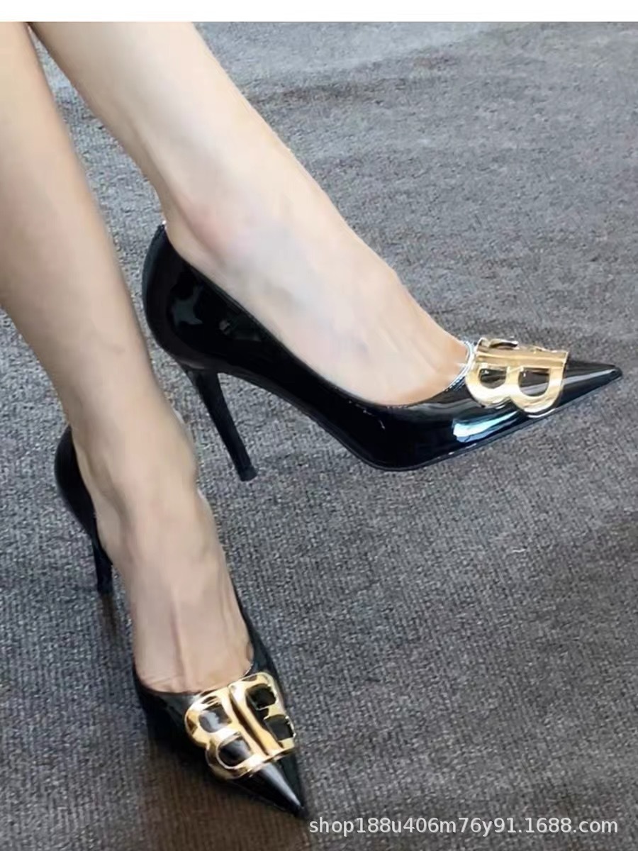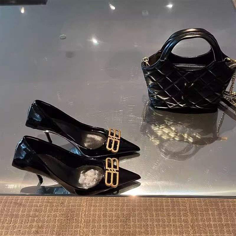 黑色漆皮名媛气质细跟尖头高跟鞋女双b时尚百搭秋冬浅口法式单鞋
