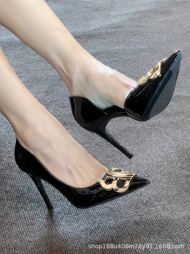 【现货】金属双扣漆皮高跟鞋女侧空尖头细跟浅口单鞋工作鞋御姐鞋