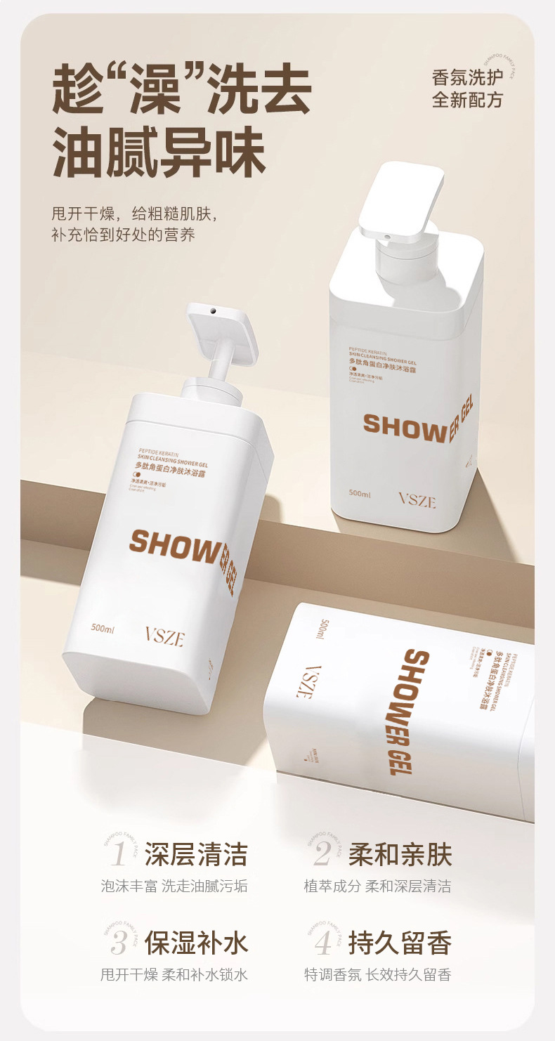 VSZE多肽角蛋白蓬松洗发水肌肤沐浴露丝润护发素三款男女专用批发