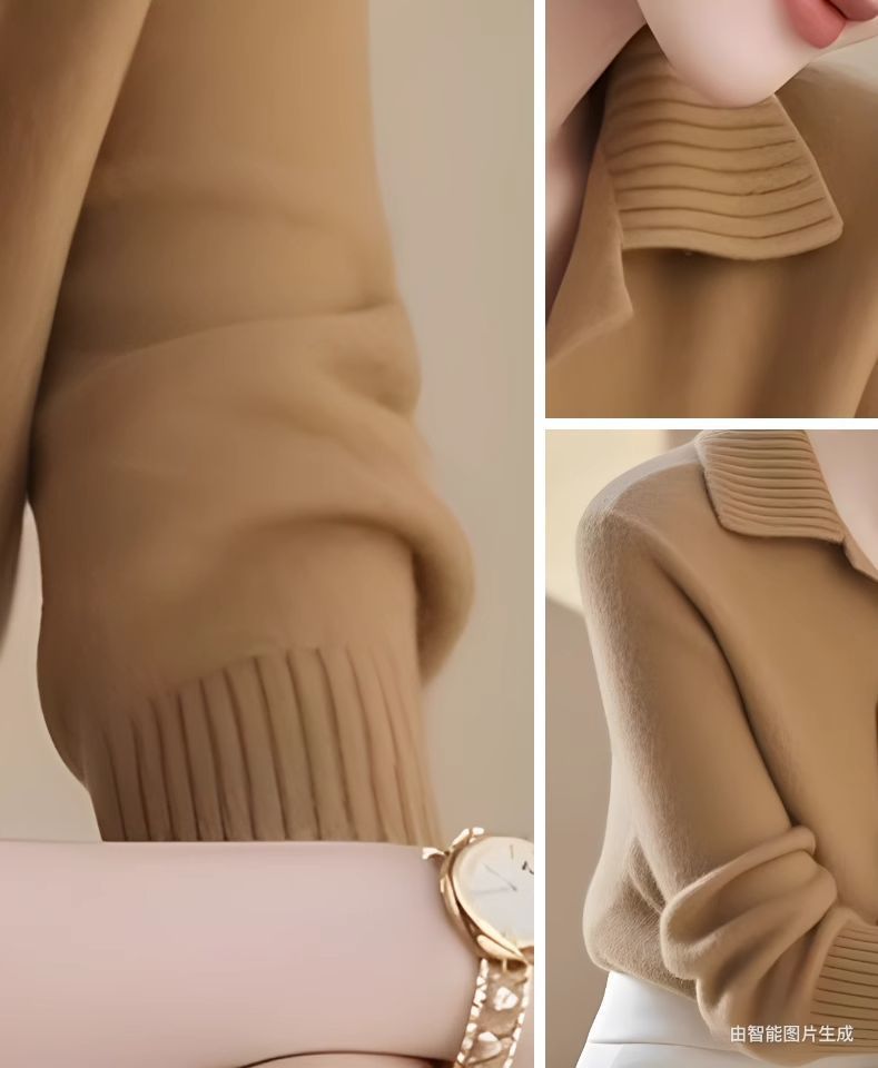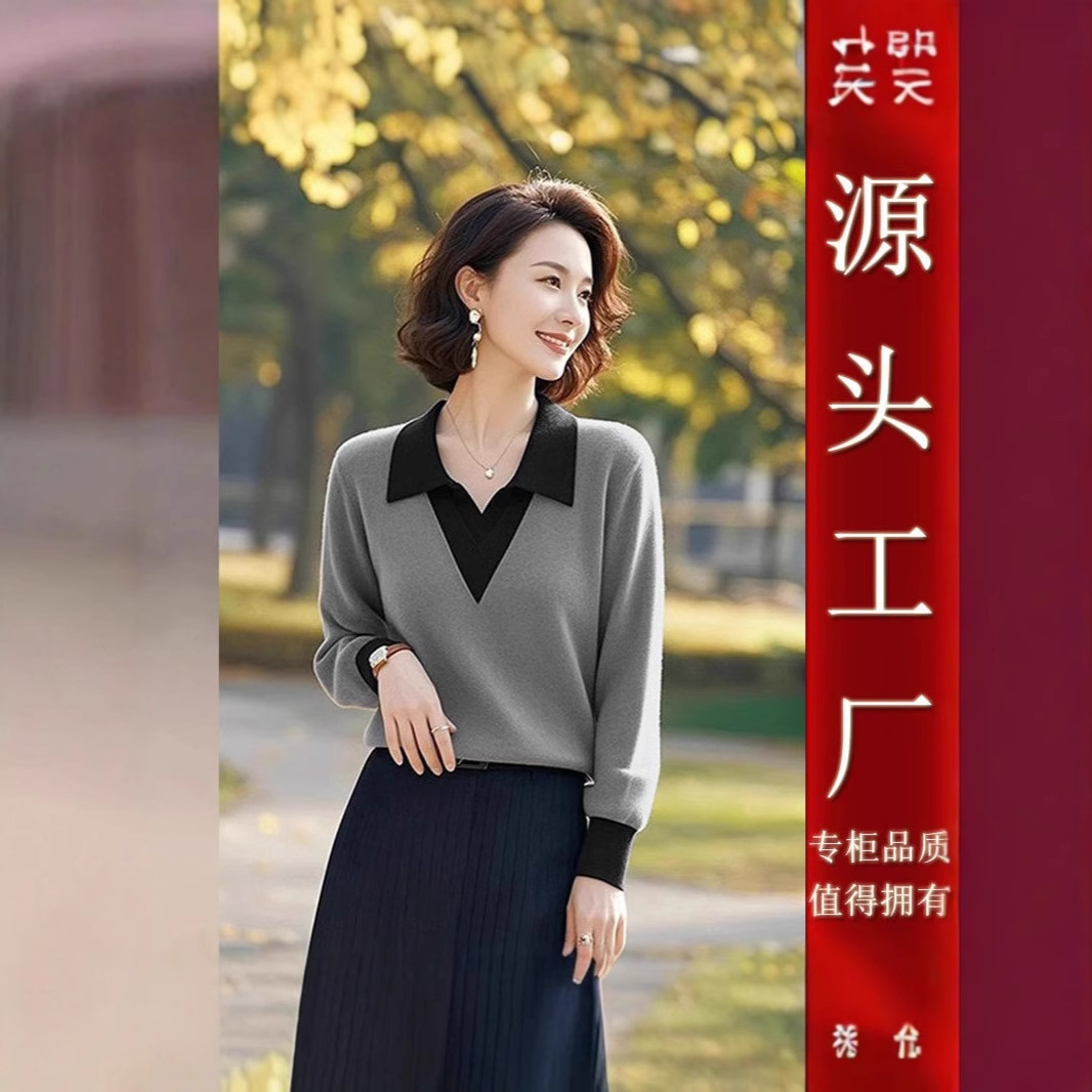 新款2025春秋季假两件针织翻领宽松针织衫打底显瘦毛衣洋气上衣