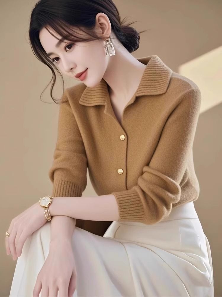 【绵羊绒】羊绒开衫女洋气宽松翻领毛衣羊毛针织衫短外套加厚秋冬
