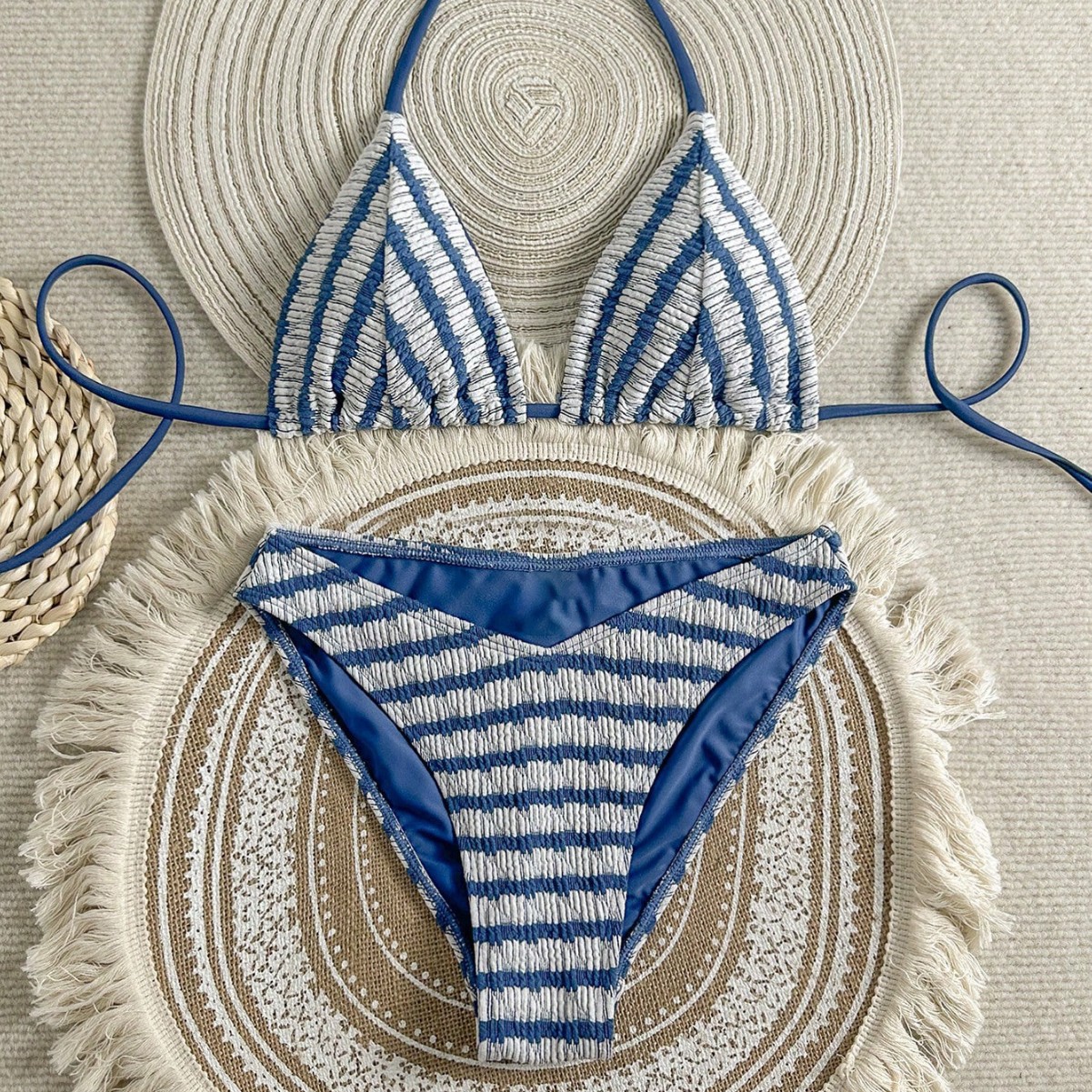 欧美外贸跨境 提花条纹彩色系带分体三点式比基尼泳衣女套装 厂家
