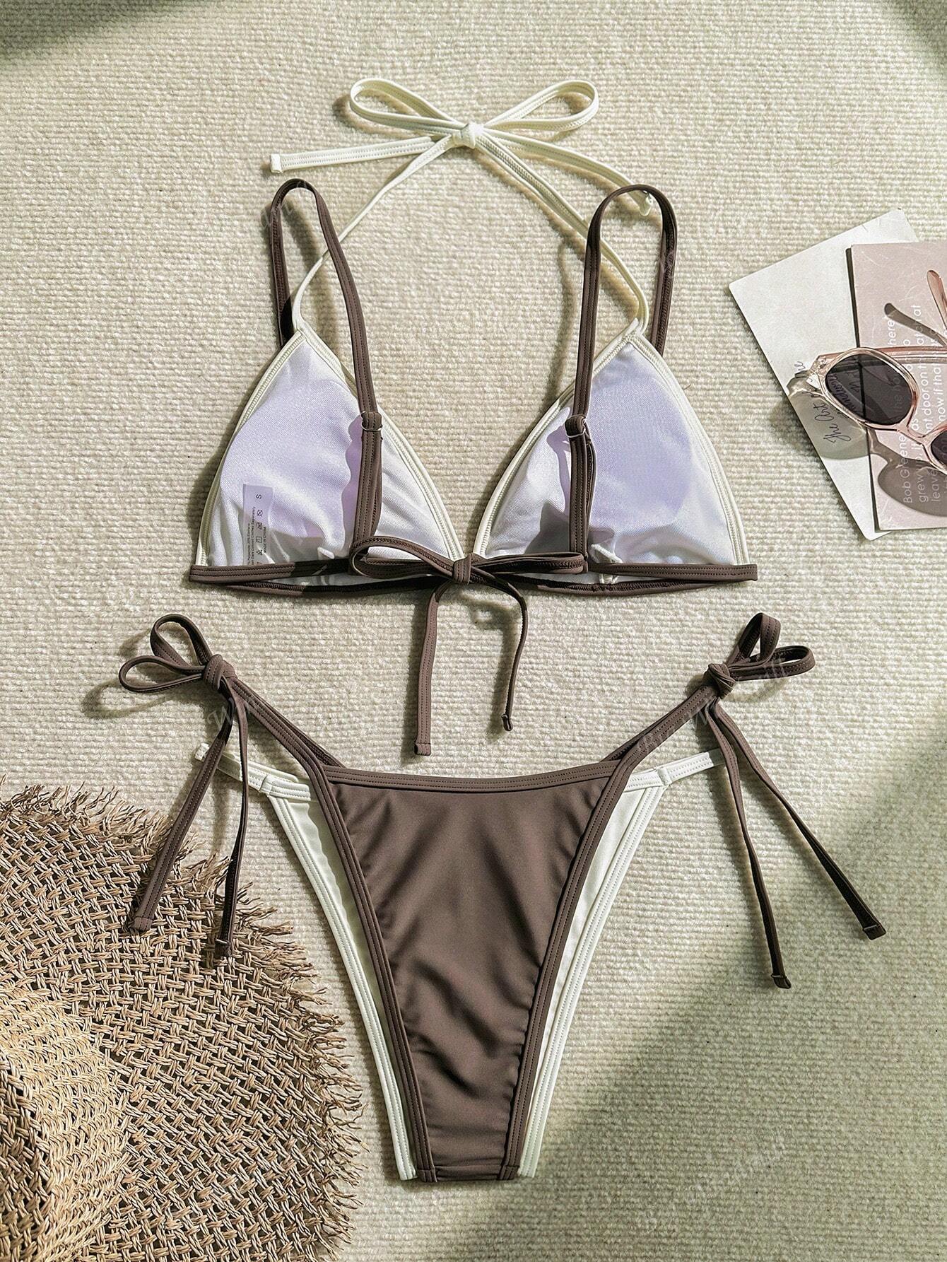 欧美外贸跨境双层 2 件套撞色分体三点式比基尼可调节 泳衣女泳装