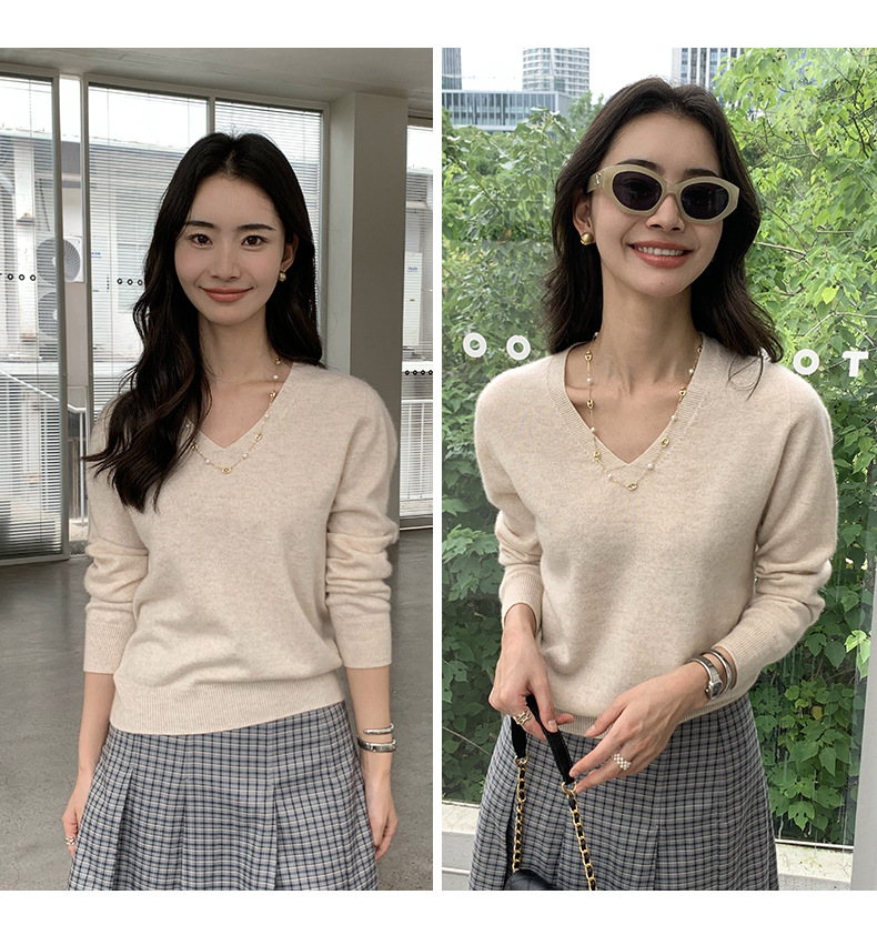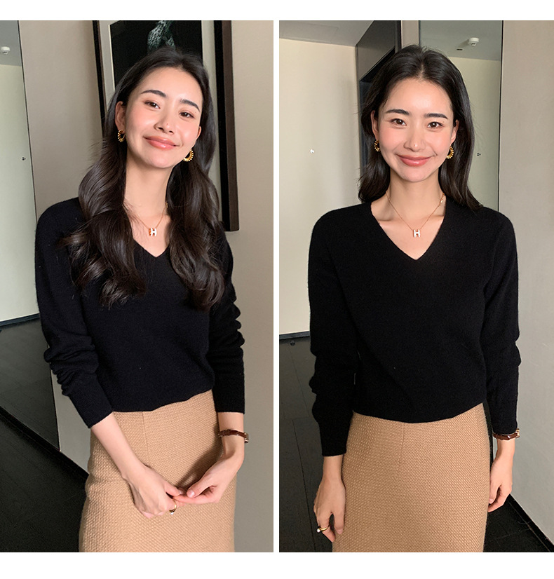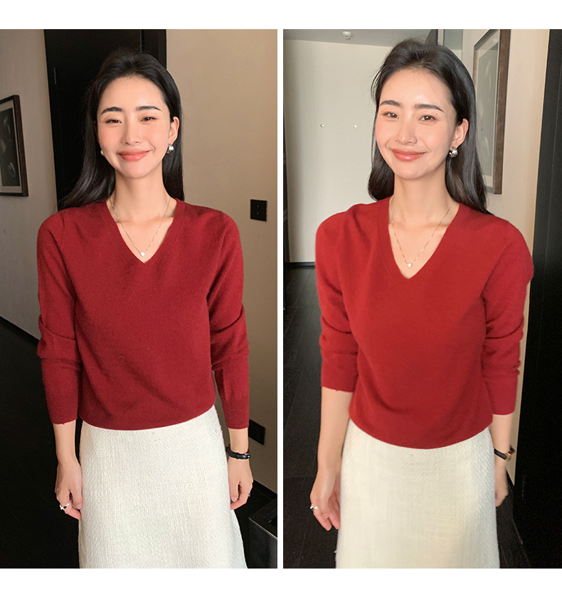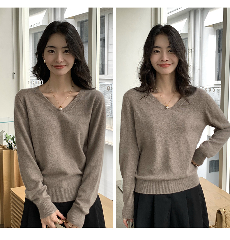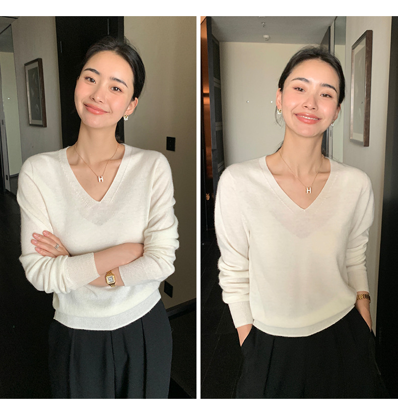 V领精纺100%羊毛衫女秋冬可机洗上衣纯色保暖内搭针织羊毛毛衣