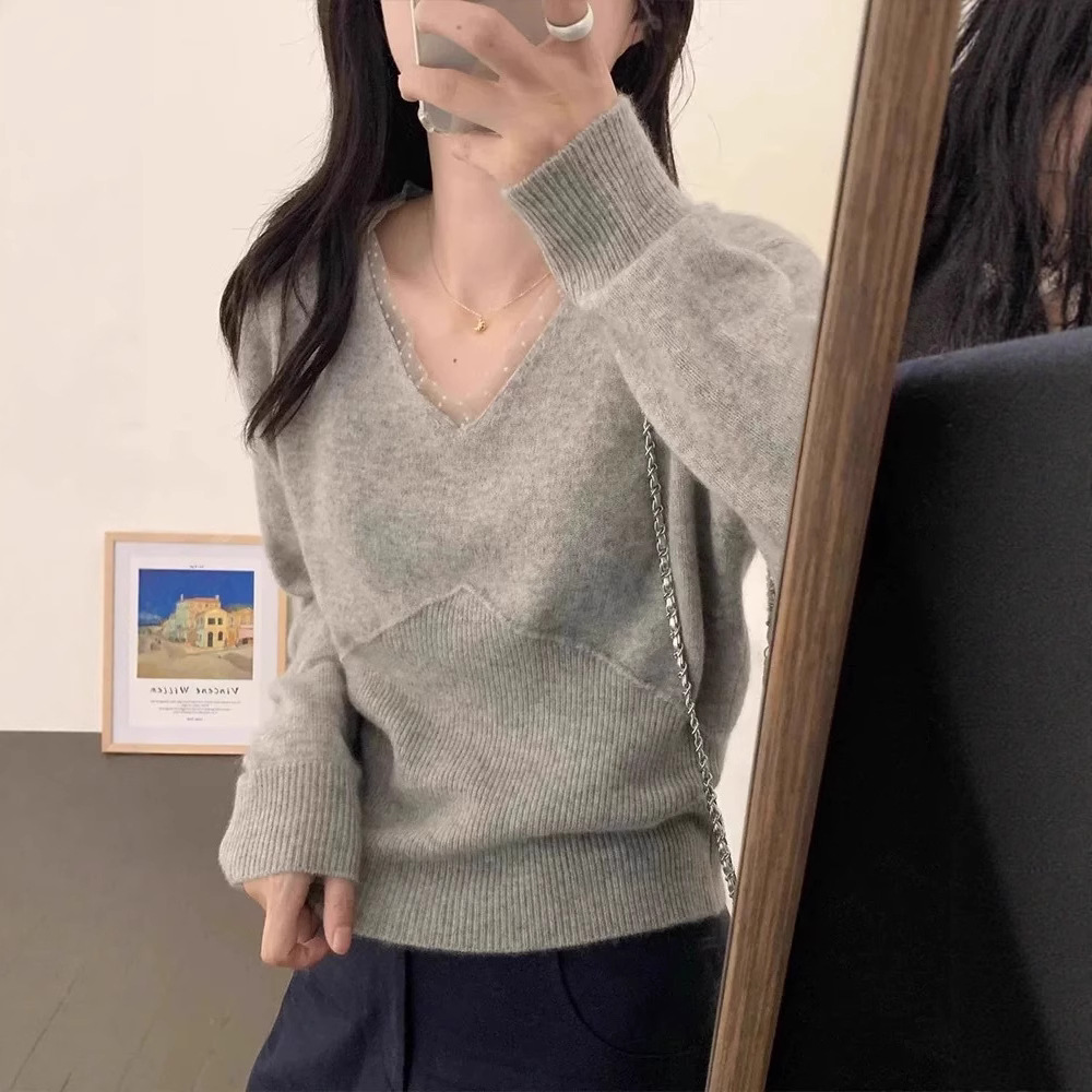 法式蕾针织打底衫秋冬软糯内搭宽松短款显瘦丝边毛衣V领慵懒上衣