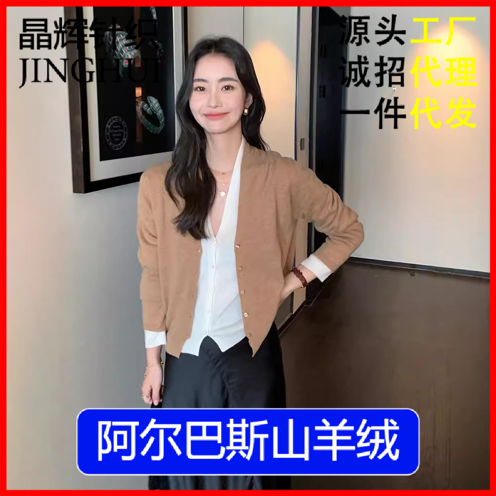 秋のカーディガンの女性vネックニットのセーターのショートタイプは、ゆったりとした高級感のあるカシミヤのコートの質感のセーターをカバーしています。