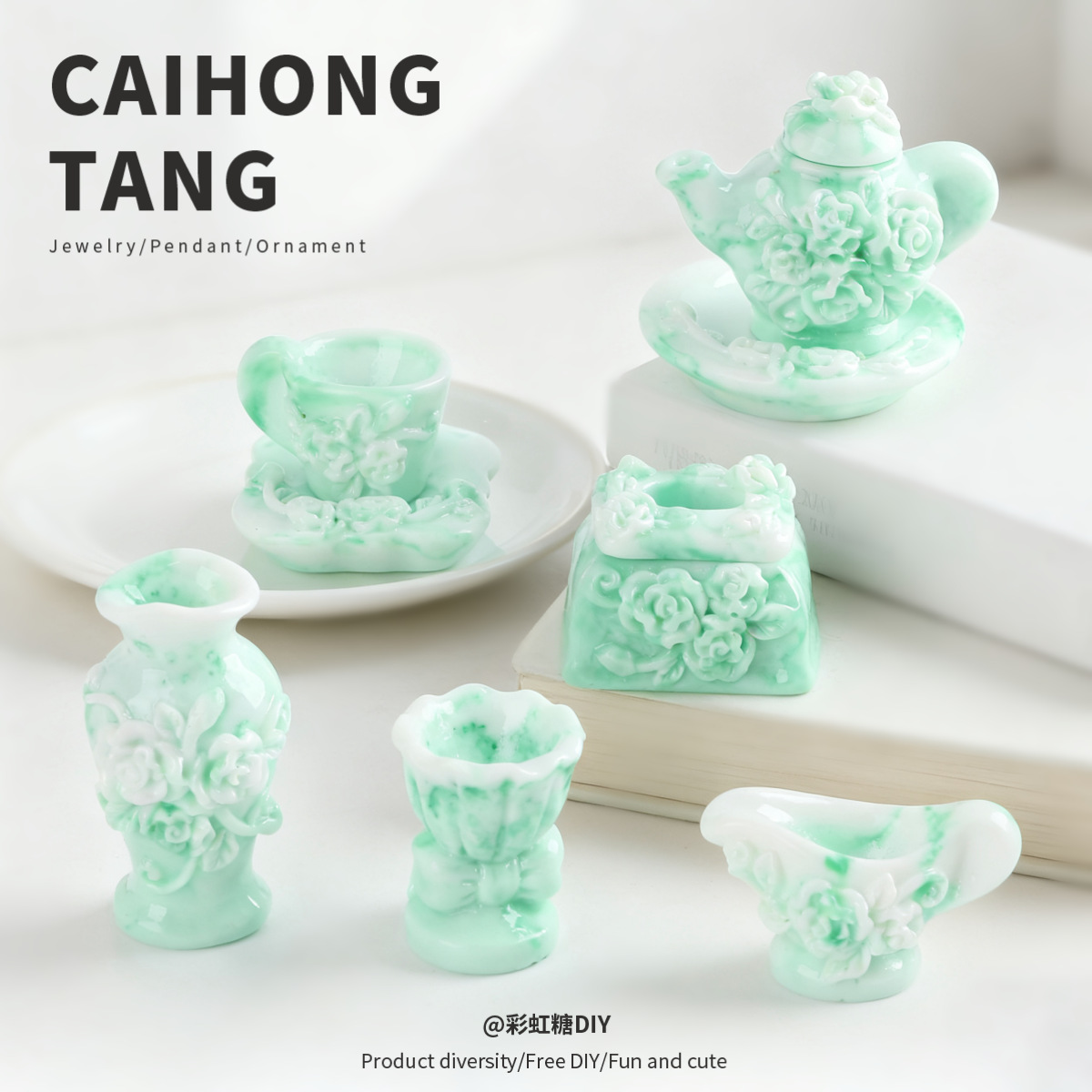 卡通树脂仿真青花瓷绿色茶具 DIY家居摆件材料自制家居造景小摆件