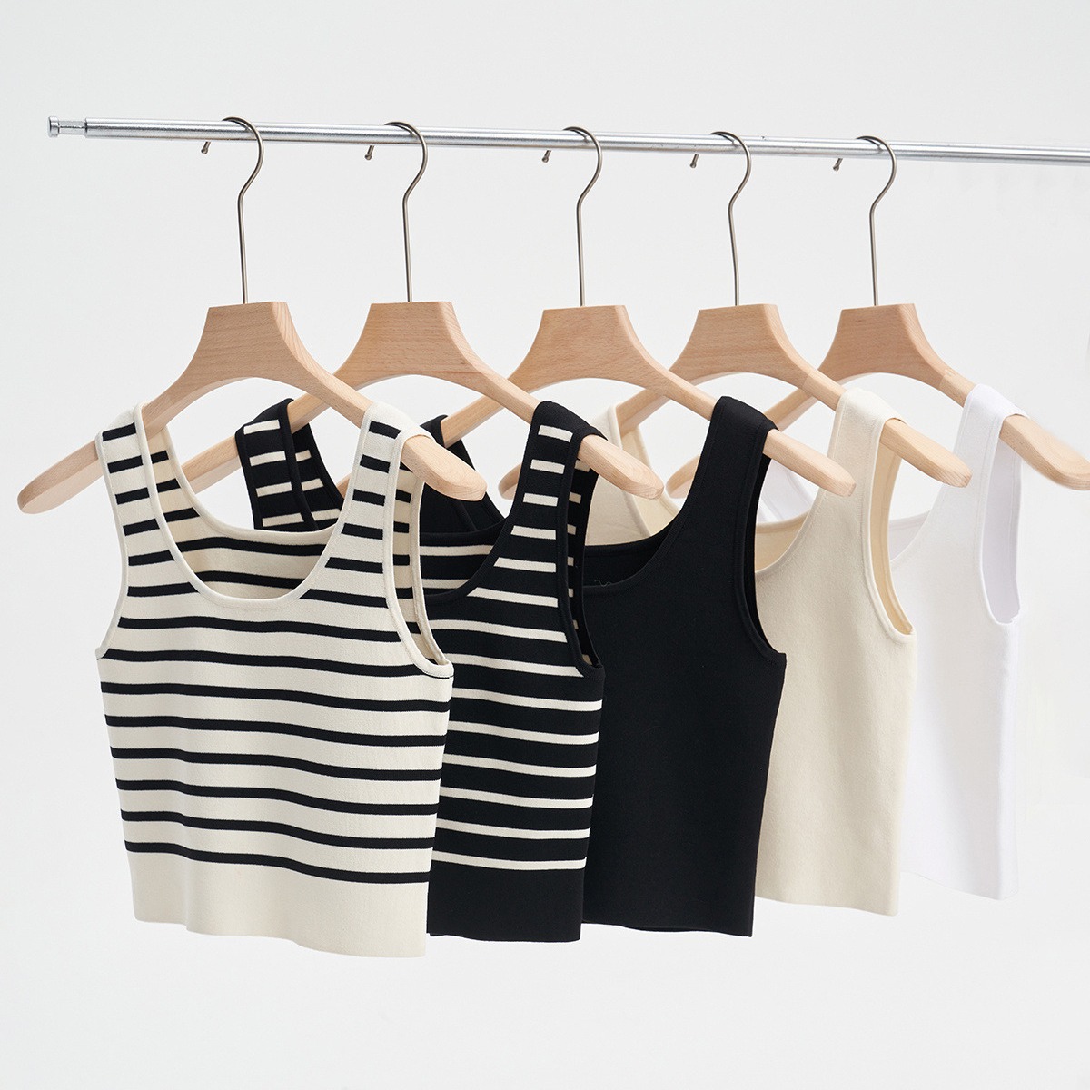 微太ったmm針ストラップベスト女性爽やかな氷糸U襟ストライプの短い弾力性のあるニットのベスト春夏