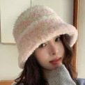 秋冬韩版混色毛绒渔夫帽女保暖护耳显脸小盆帽百搭条纹针织水桶帽