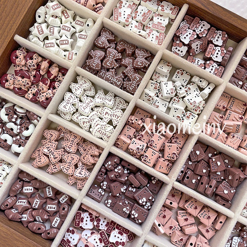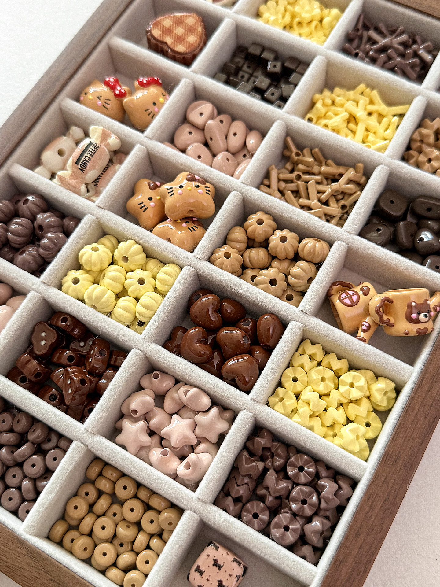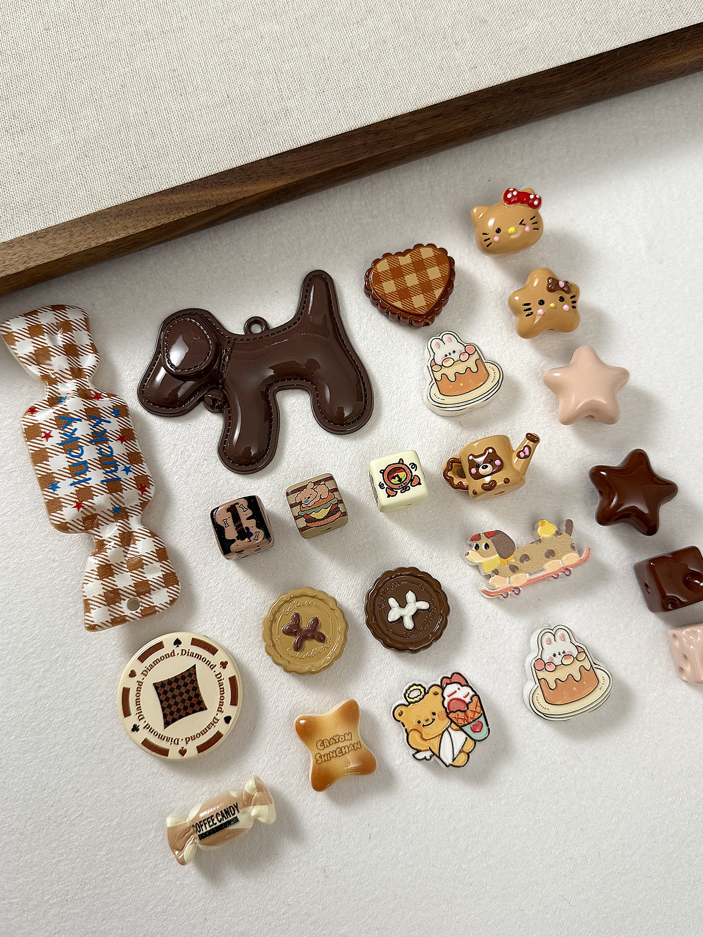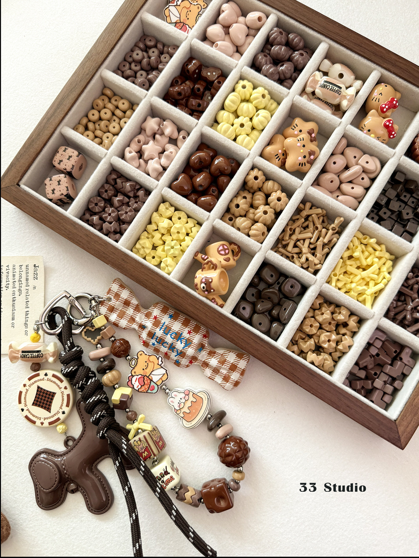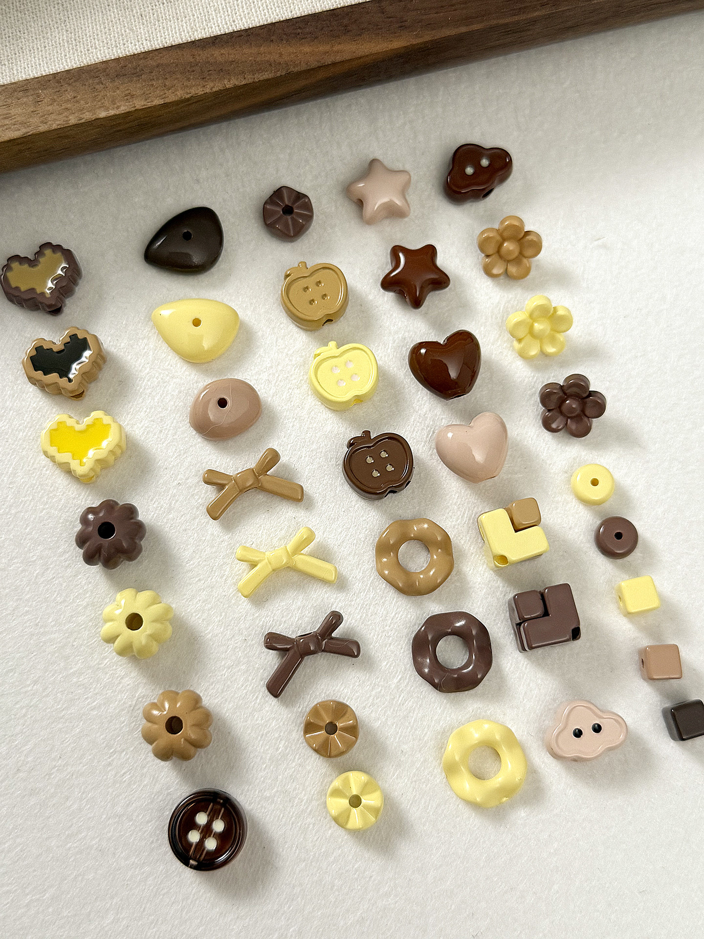 #1 浅咖烤漆小南瓜珠 (5颗 ),#2 浅黄烤漆小南瓜珠 (5颗 ),#3 深咖烤漆小南瓜珠 (5颗 ),#4 深咖群边13mm (5颗 ),#5 浅咖裙边13mm (5颗 ),#6 浅黄裙边13mm (5颗 ),#7 深咖碎石 随机(5颗 ),#8 浅咖碎石 随机(5颗 ),#9 浅黄碎石 随机 (5颗 ),#10 浅咖隔片7*4mm (5颗 ),#10-1 深咖隔片7*4mm (5颗 ),#11 浅黄隔片7*4mm (5颗 ),#12 深咖半边格子 (4颗 ),#13 浅咖半边格子 (4颗 ),#14 浅黄半边格子 (5颗 ),#15 深咖小蝴蝶结 (5颗 ),#16 浅咖小蝴蝶结 (5颗 ),#17 浅黄小蝴蝶结 (5颗 ),#18 咖色小方块5mm (5颗 ),#19 深咖小方块5mm (5颗 ),#20 浅黄小方块5mm (5颗 ),#21 深咖波浪隔珠9mm (5颗 ),#22 咖色波浪隔珠9mm (5颗 ),#23 浅黄波浪隔珠9mm (5颗 ),#24 深咖算盘珠8*5mm(5颗 ),#25 咖色算盘珠8*5mm (5颗 ),#26 浅黄算盘珠8*5mm (5颗 ),#27 深咖爱心13mm (5颗 ),#28 咖色爱心13mm (5颗 ),#29 浅黄爱心13mm (5颗 ),#30 浅黄小花 (5颗 ),#31 深咖小花 (5颗 ),#32 咖色小花 (5颗 ),#33 深咖苹果纽扣 (5颗 ),#34 咖色苹果纽扣12mm (5颗 ),#35 大号糖果 (1颗 ),#36 小糖果 (1颗 ),#37 深咖格子爱心 (1颗 ),#38 方块长条狗 (1颗 ),#39 方块闹钟 (1颗 ),#40 方块卡通 (1颗 ),#41 手绘猫 (1颗 ),#42 手绘星星 (1颗 ),#43 手绘杯子 (1颗 ),#44 卡通面包 (1颗 ),#45 格子大圆珠 (1颗 ),#46 深咖包包笑脸 (1颗 ),#47 印花腊肠狗 (1颗 ),#48 印花小熊(1颗 ),#49 印花兔子 (1颗 ),#50 合金小狗(1颗 ),#51 深咖蹦迪球 (1颗 ),#52 毛线球 (5颗 ),#53 深咖奶酪14mm (1颗 )