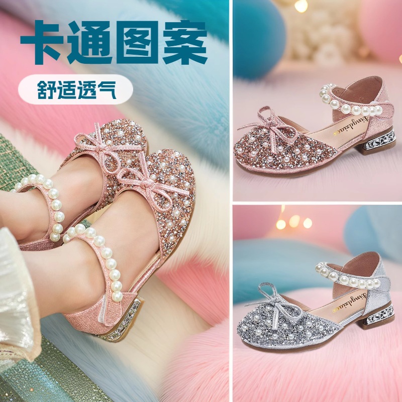 女の子のシングルシューズ、ハイヒールの革靴、エルサの新しいスパンコールピンクのプリンセスシューズ、ダンスパフォーマンスの子供靴、小中型の子供用クリスタルシューズ