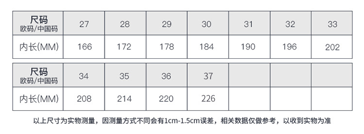 尺码 27码内长约16.8CM,28码内长约17.4CM,29码内长约18CM,30码内长约18.6CM,31码内长约19.2CM,32码内长约19.8CM,33码内长约20.4CM,34码内长约21CM,35码内长约21.6CM,36码内长约22.2CM,37码内长约22.8CM,27-31【拍5双】,32-37【拍6双】