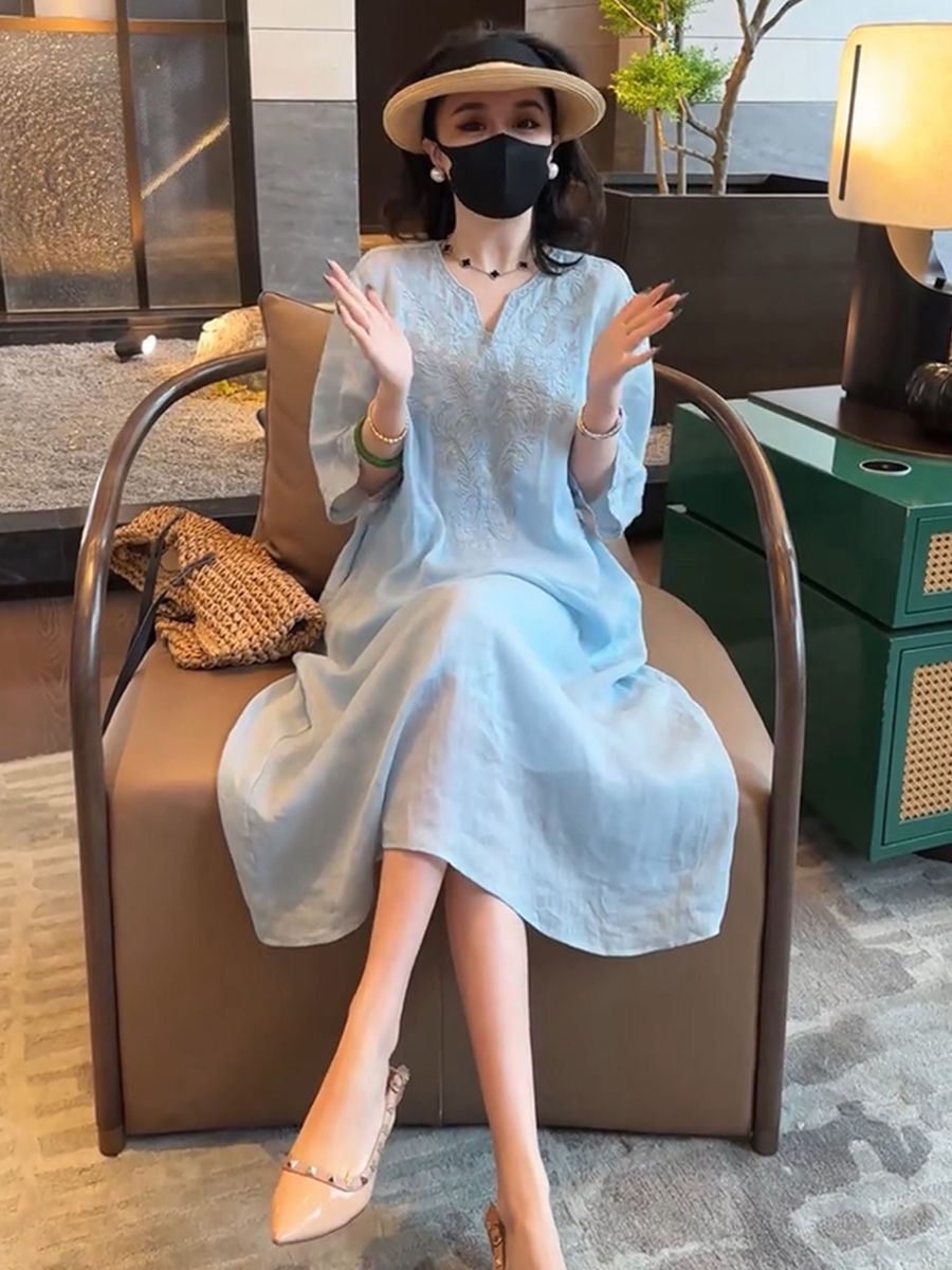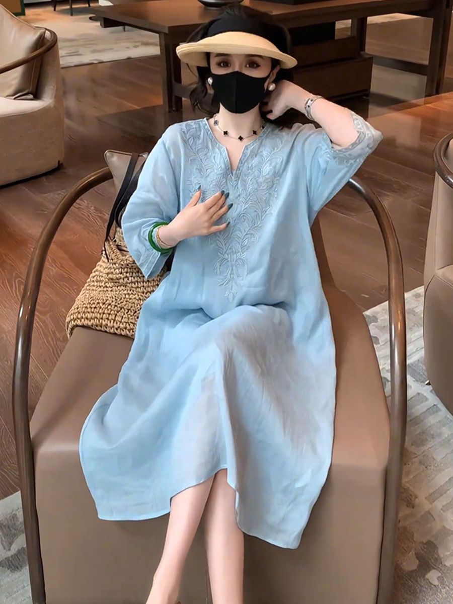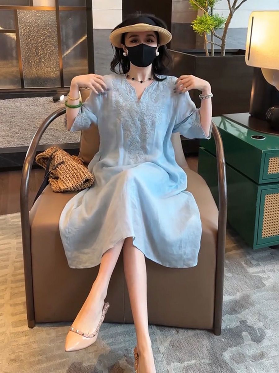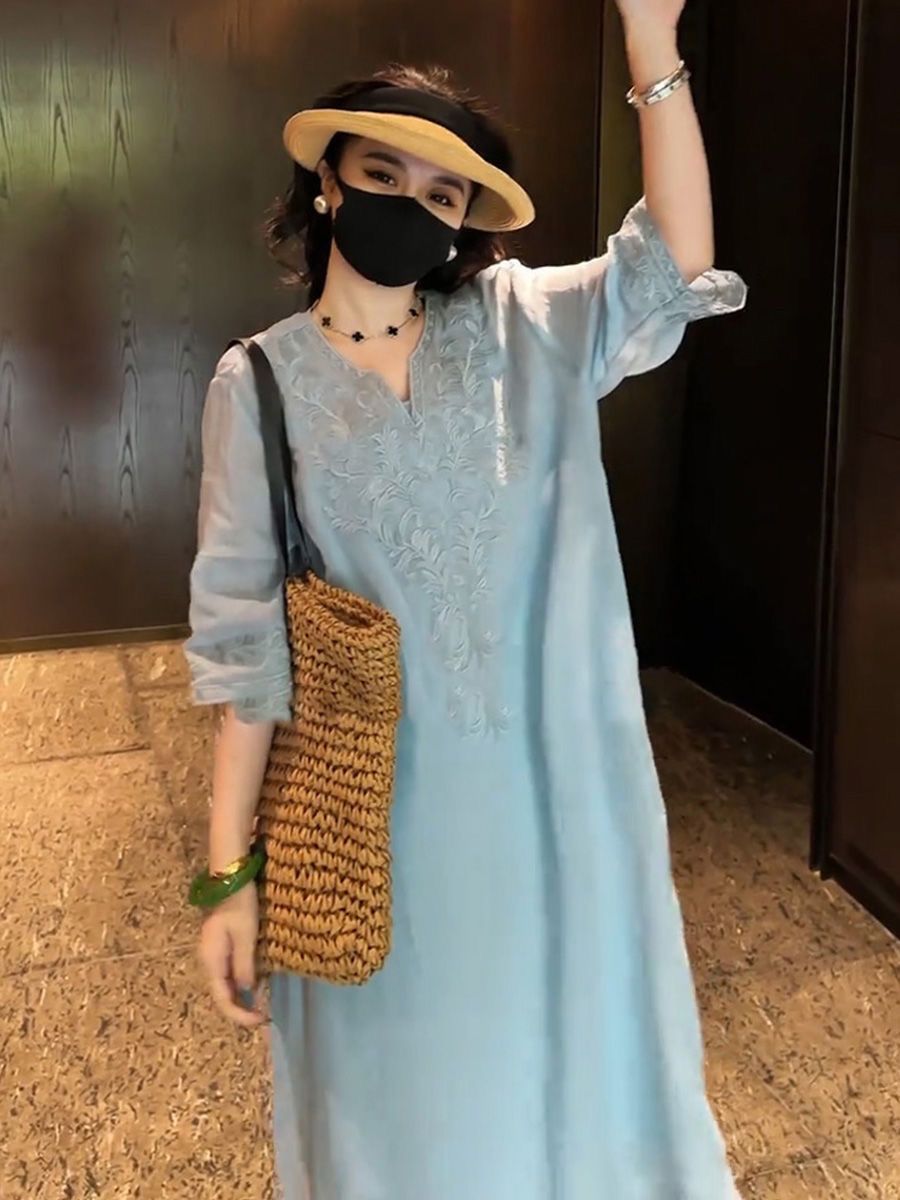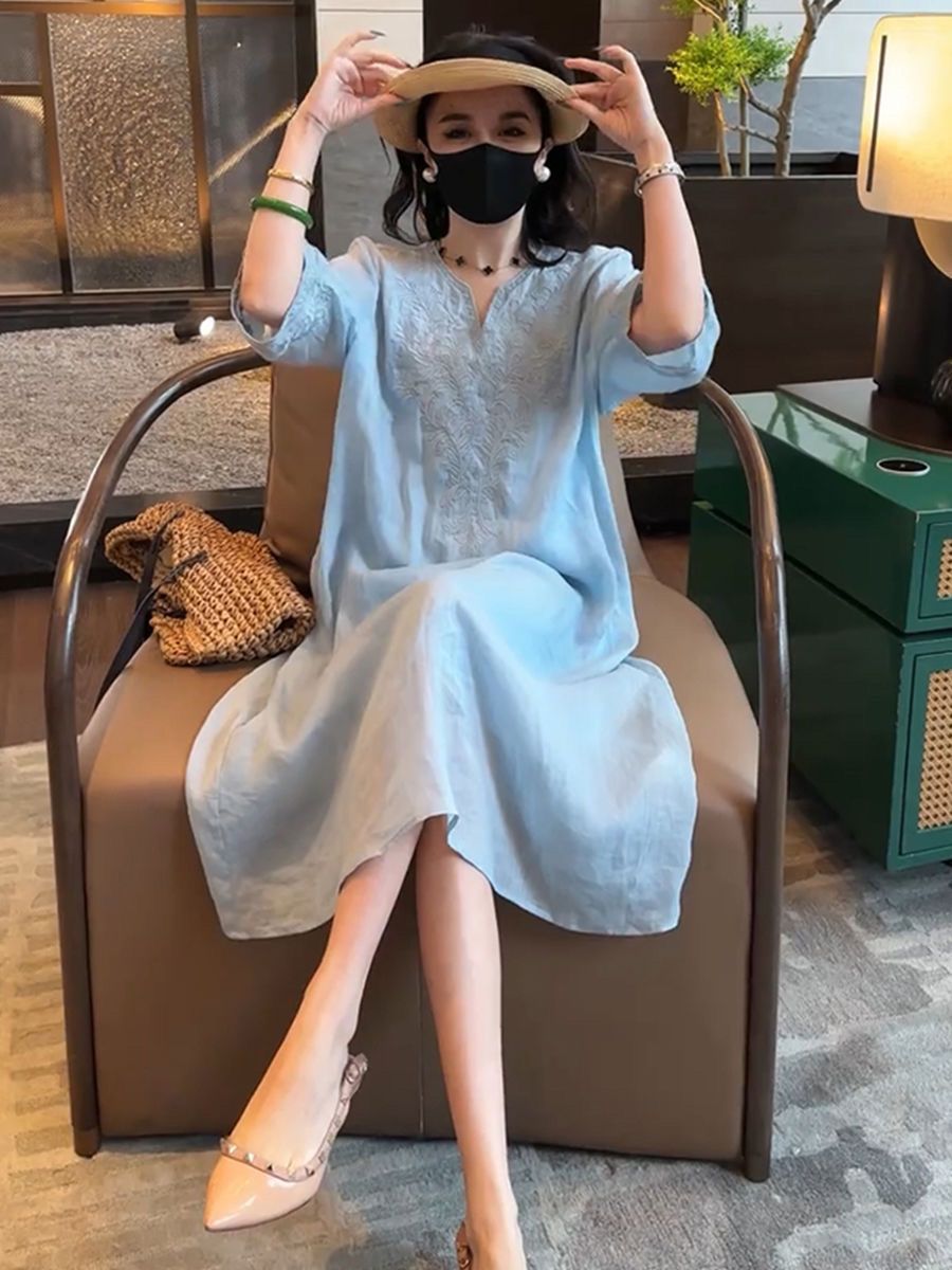 复古文艺棉麻刺绣V领连衣裙女2025夏季新款大码宽松显瘦气质长裙