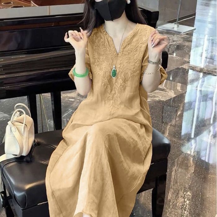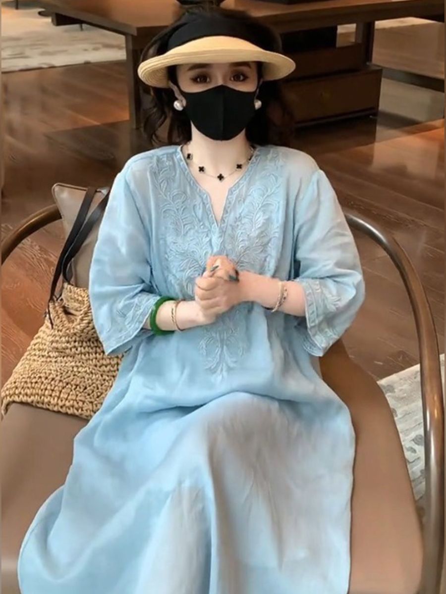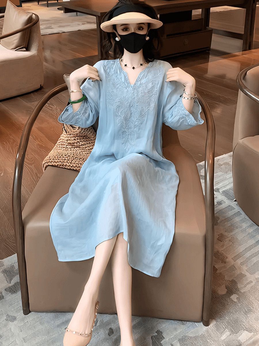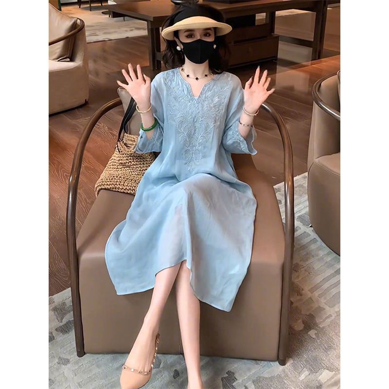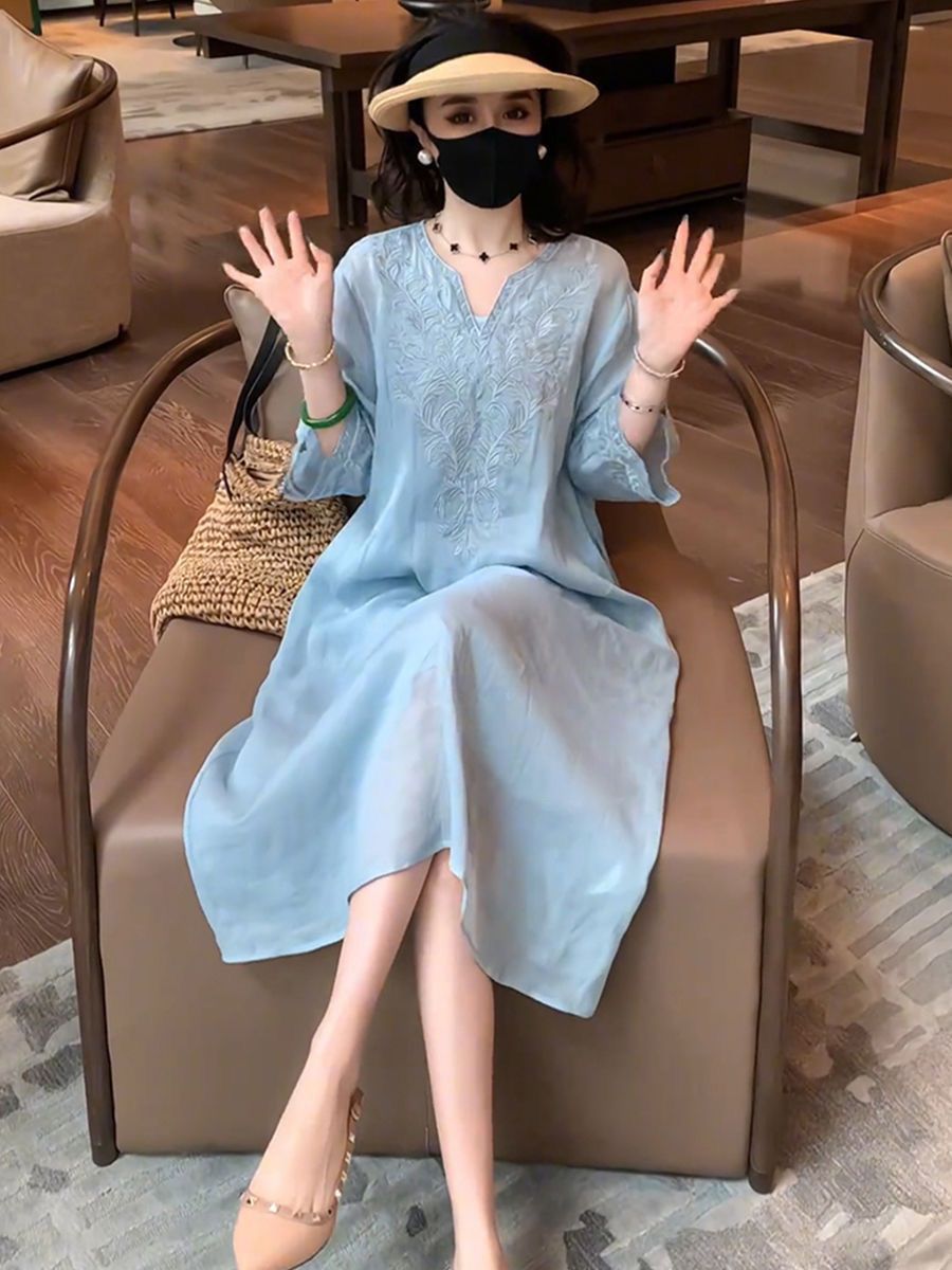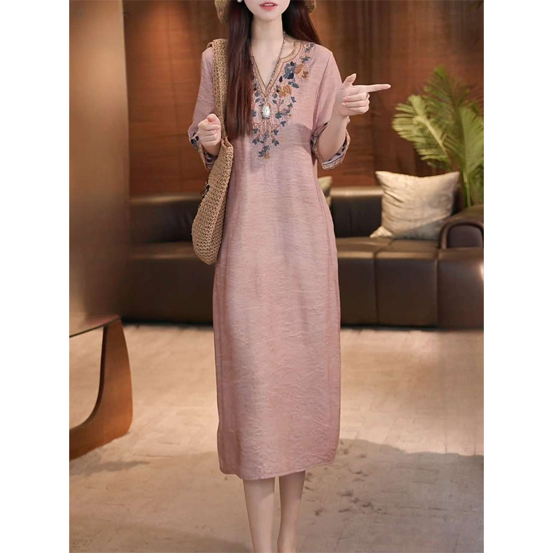 复古文艺棉麻刺绣V领连衣裙女2025夏季新款大码宽松显瘦气质长裙