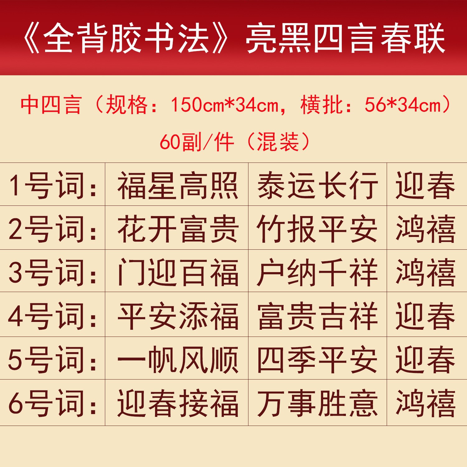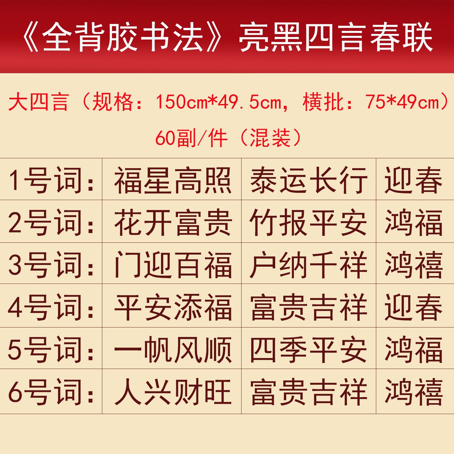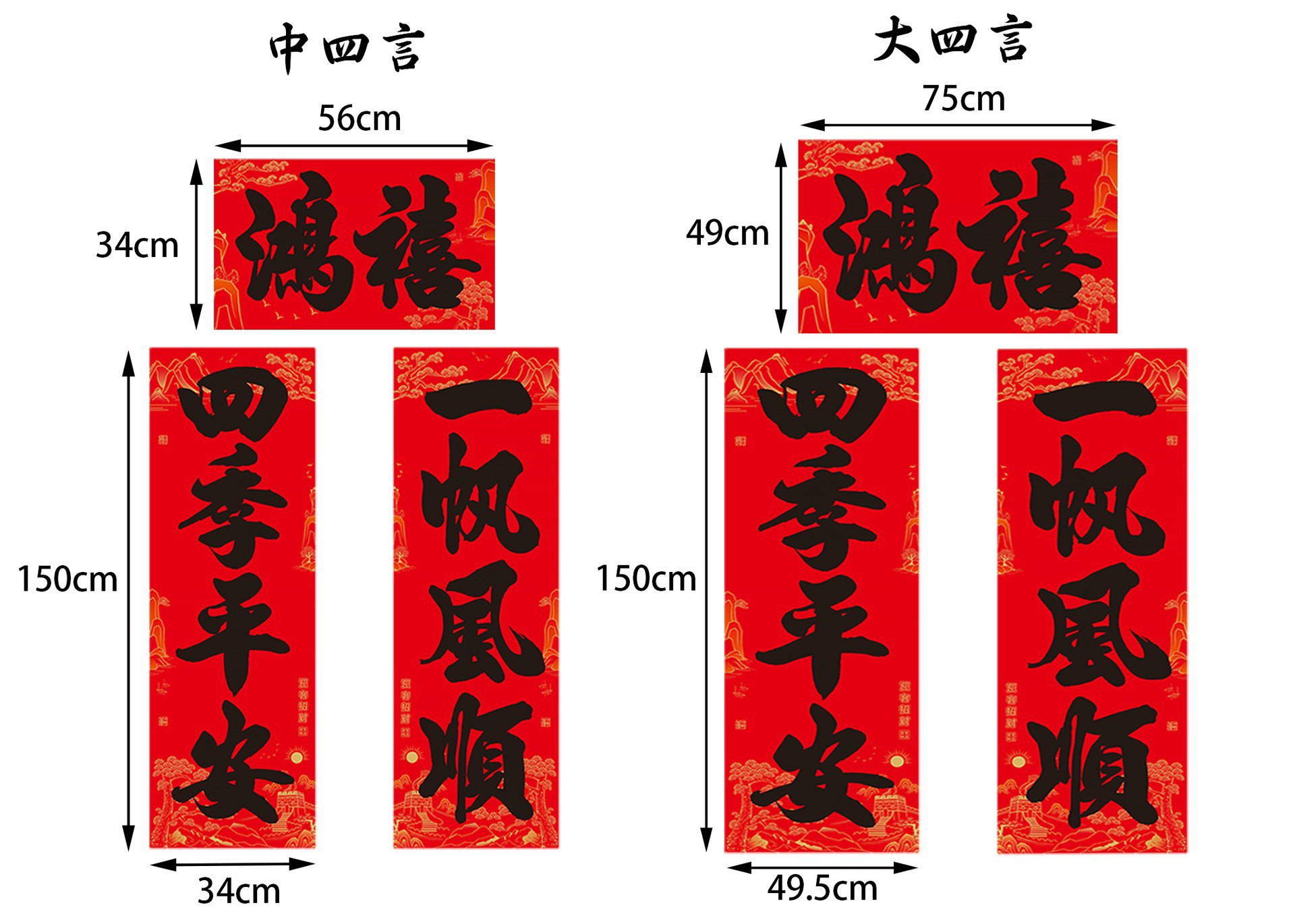 尺寸 大四言#1 福星高照,泰运长行 横头:迎春(规格:150x49.5cm),大四言#2 花开富贵,竹报平安 横头:鸿福(规格:150x49.5cm),大四言#3 门迎百福,户纳千祥 横头:鸿禧(规格:150x49.5cm),大四言#4 平安添福,富贵吉祥 横头:迎春(规格:150x49.5cm),大四言#5 一帆风顺,四季平安 横头:鸿福(规格:150x49.5cm),大四言#6 人兴财旺,富贵吉祥 横头:鸿禧(规格:150x49.5cm),中四言#1 福星高照,泰运长行 横头:迎春(规格:150x34cm),中四言#2 花开富贵,竹报平安 横头:鸿禧(规格:150x34cm),中四言#3 门迎百福,户纳千祥 横头:鸿禧(规格:150x34cm),中四言#4 平安添福,富贵吉祥 横头:迎春(规格:150x34cm),中四言#5 一帆风顺,四季平安 横头:迎春(规格:150x34cm),中四言#6 人兴财旺,富贵吉祥 横头:鸿禧(规格:150x34cm)