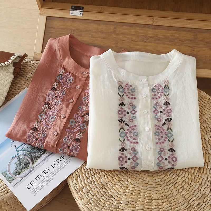 今年复古夏季新款短袖棉麻民族刺绣立领五分袖上衣女宽松显瘦薄款