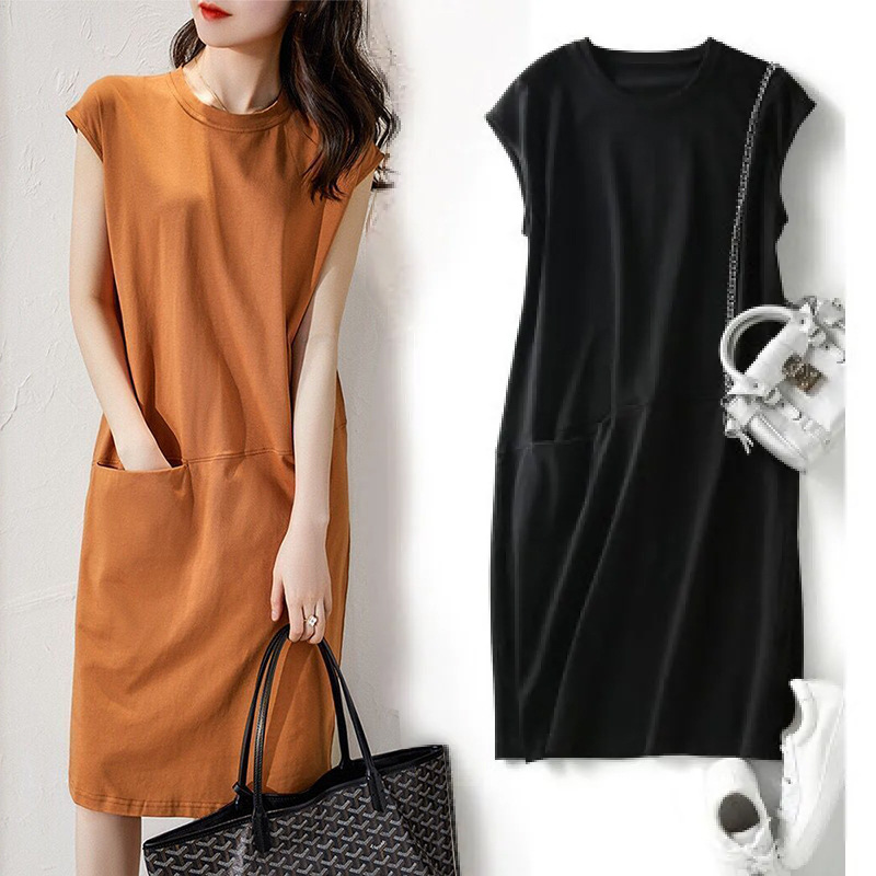 黑色显瘦夏季新款圆领纯色气质时尚无袖连衣裙优雅口袋设计感