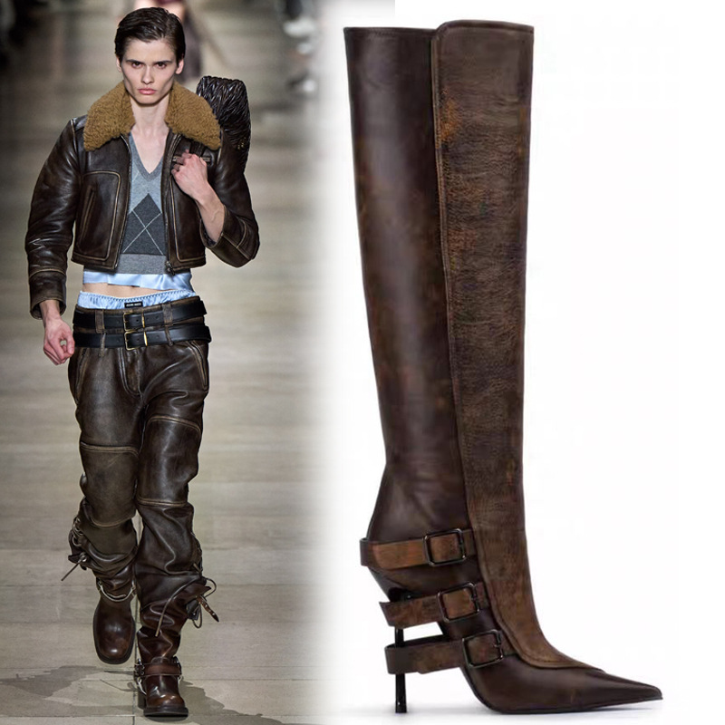 复古金属尖头细高跟多穿气质皮带扣辣妹时装靴外贸大码走秀舞台靴