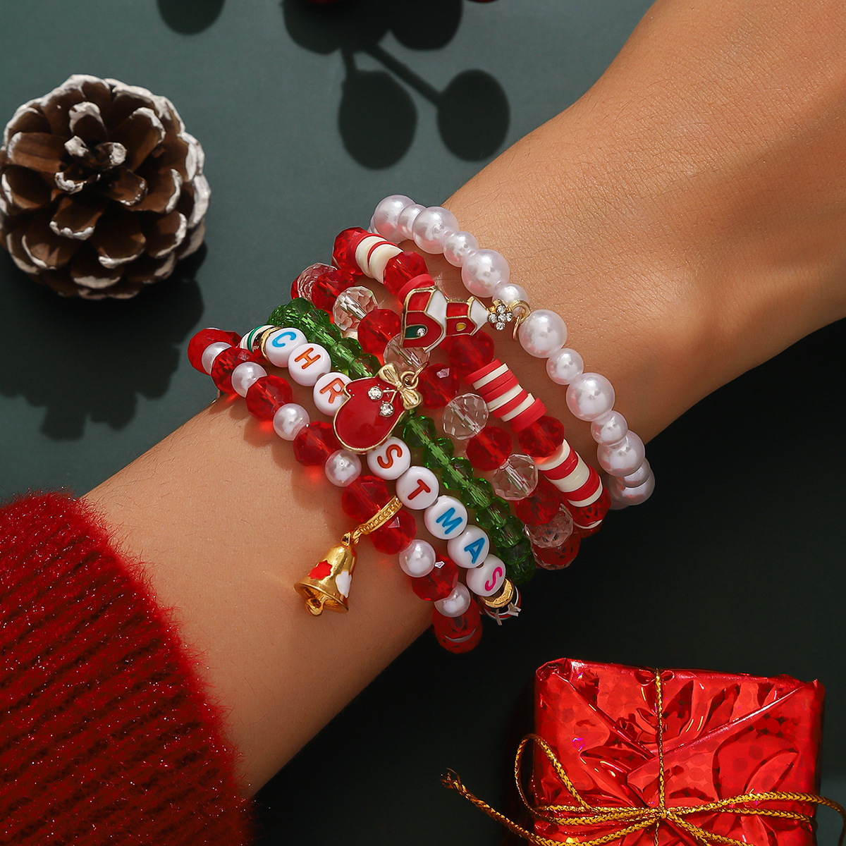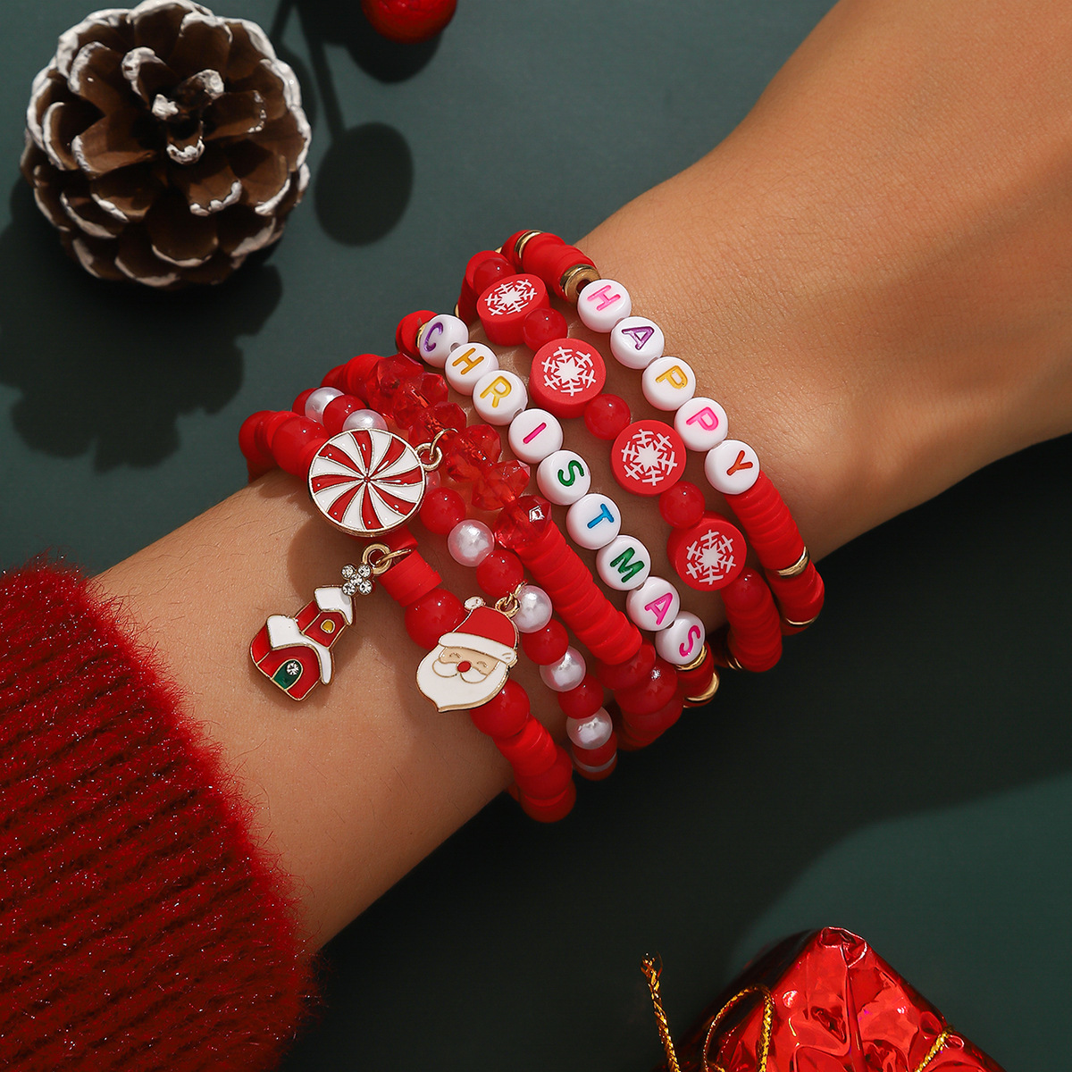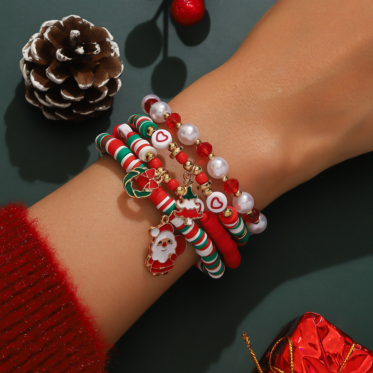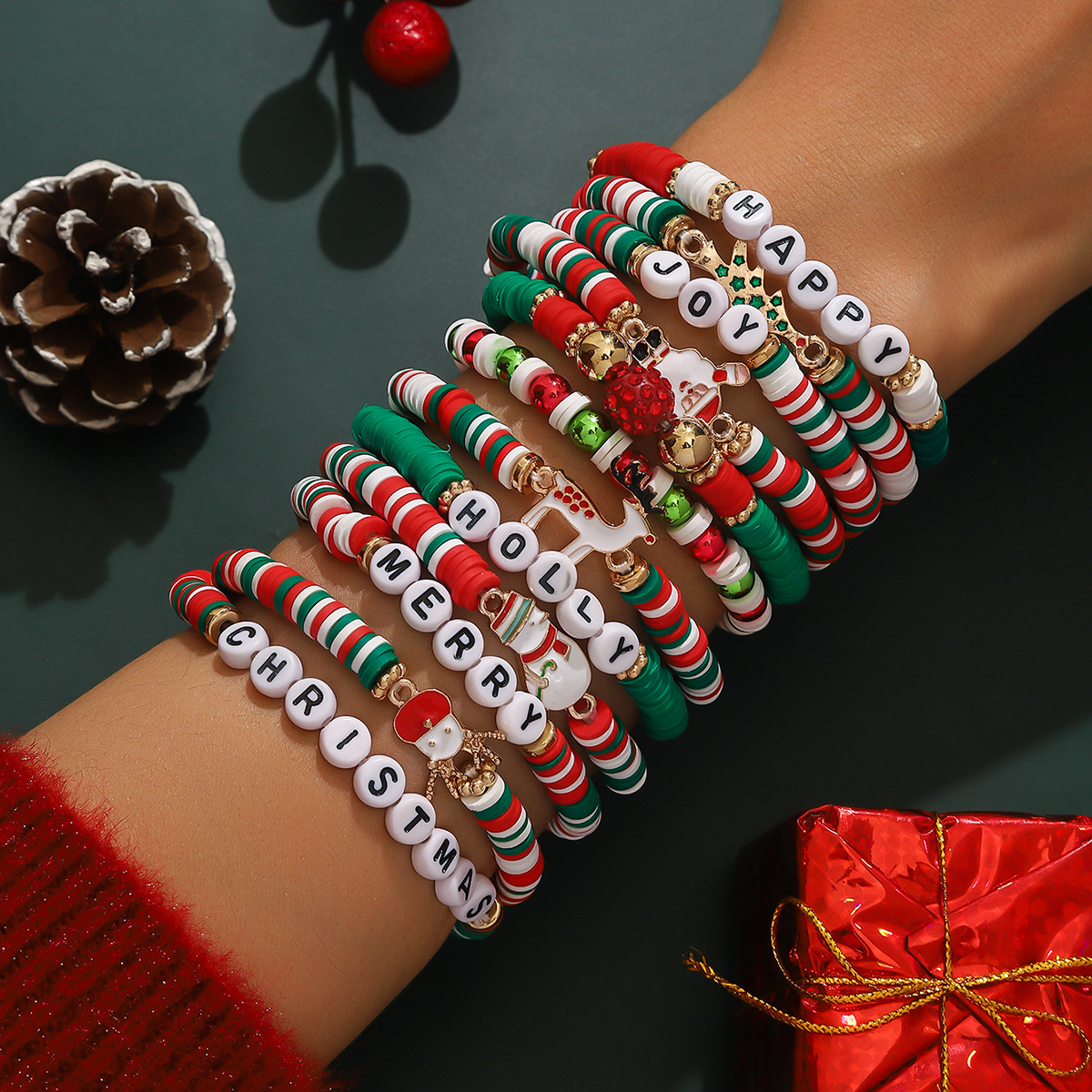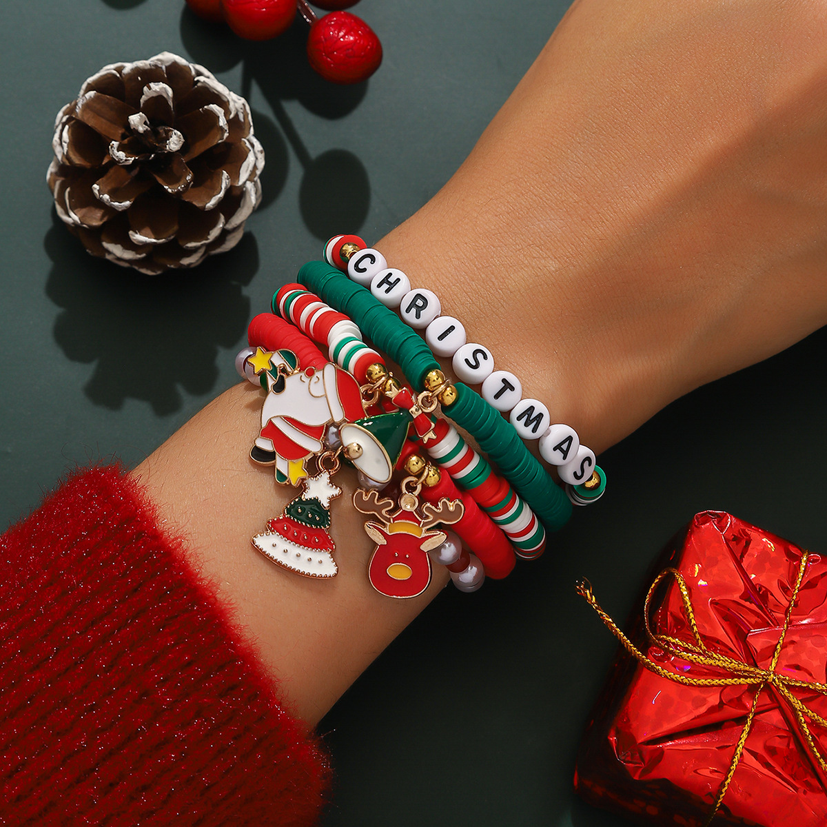 欧美跨境 圣诞老人雪花麋鹿圣诞树 混彩水晶软陶米珠手链叠戴套装