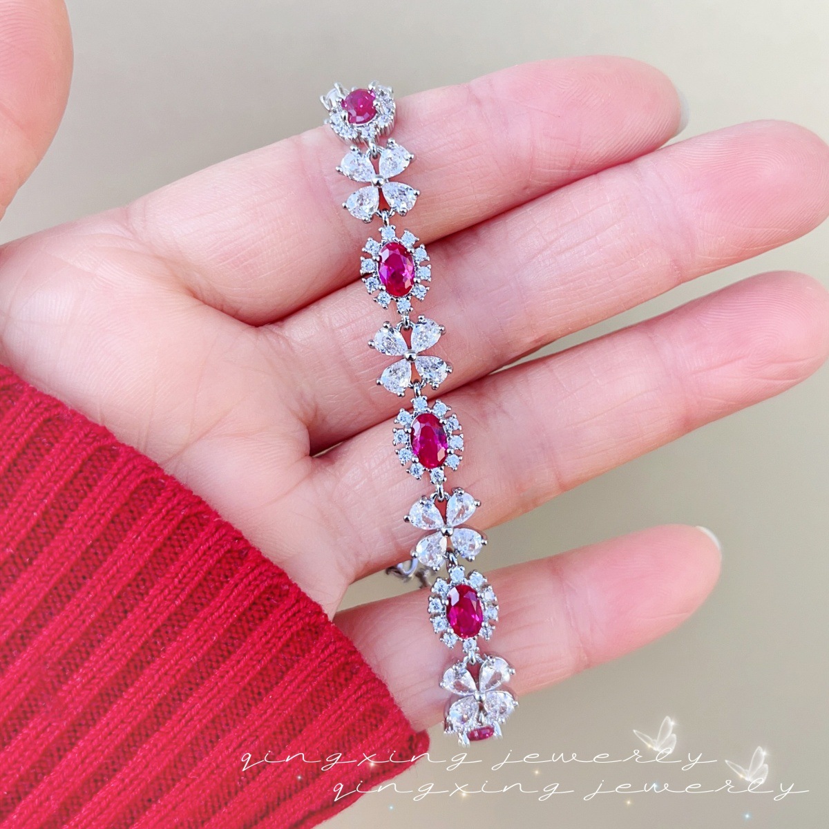 赤コランダム楕円色の宝の手はドリルの女性の超フラッシュのジルコンのファッションの宝の青いナノの人工のルビーのブレスレットを飾ります。