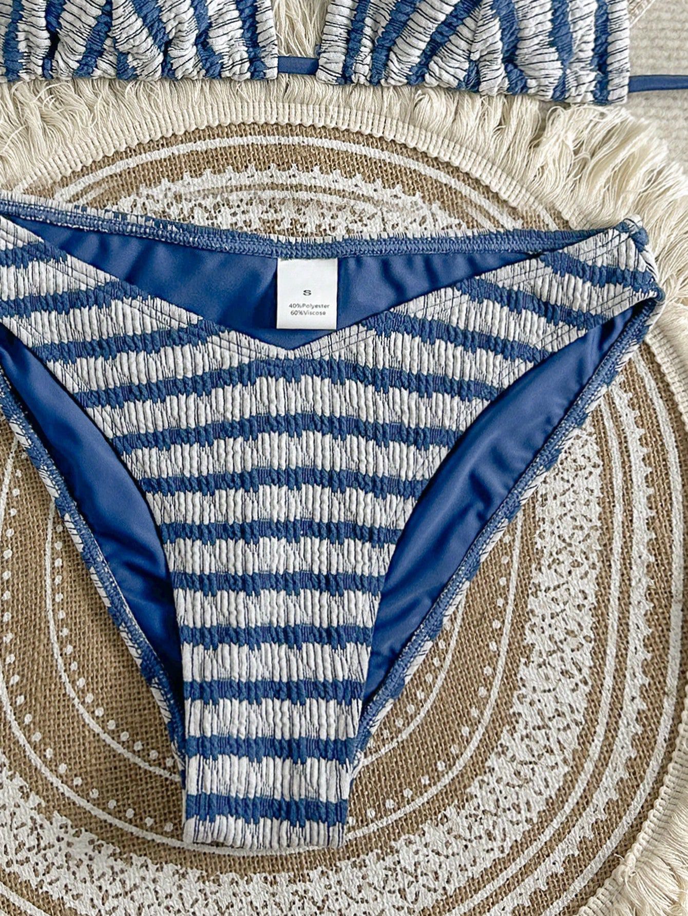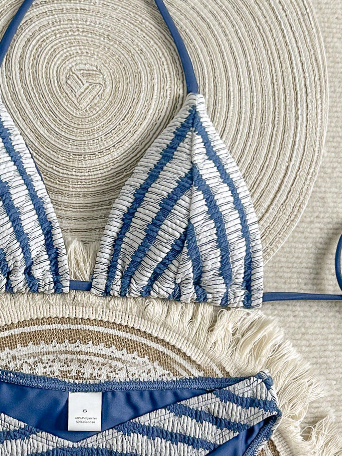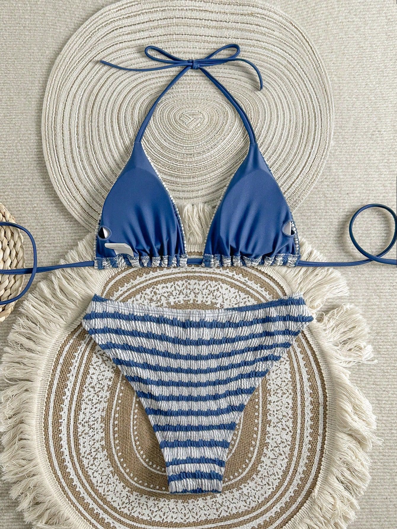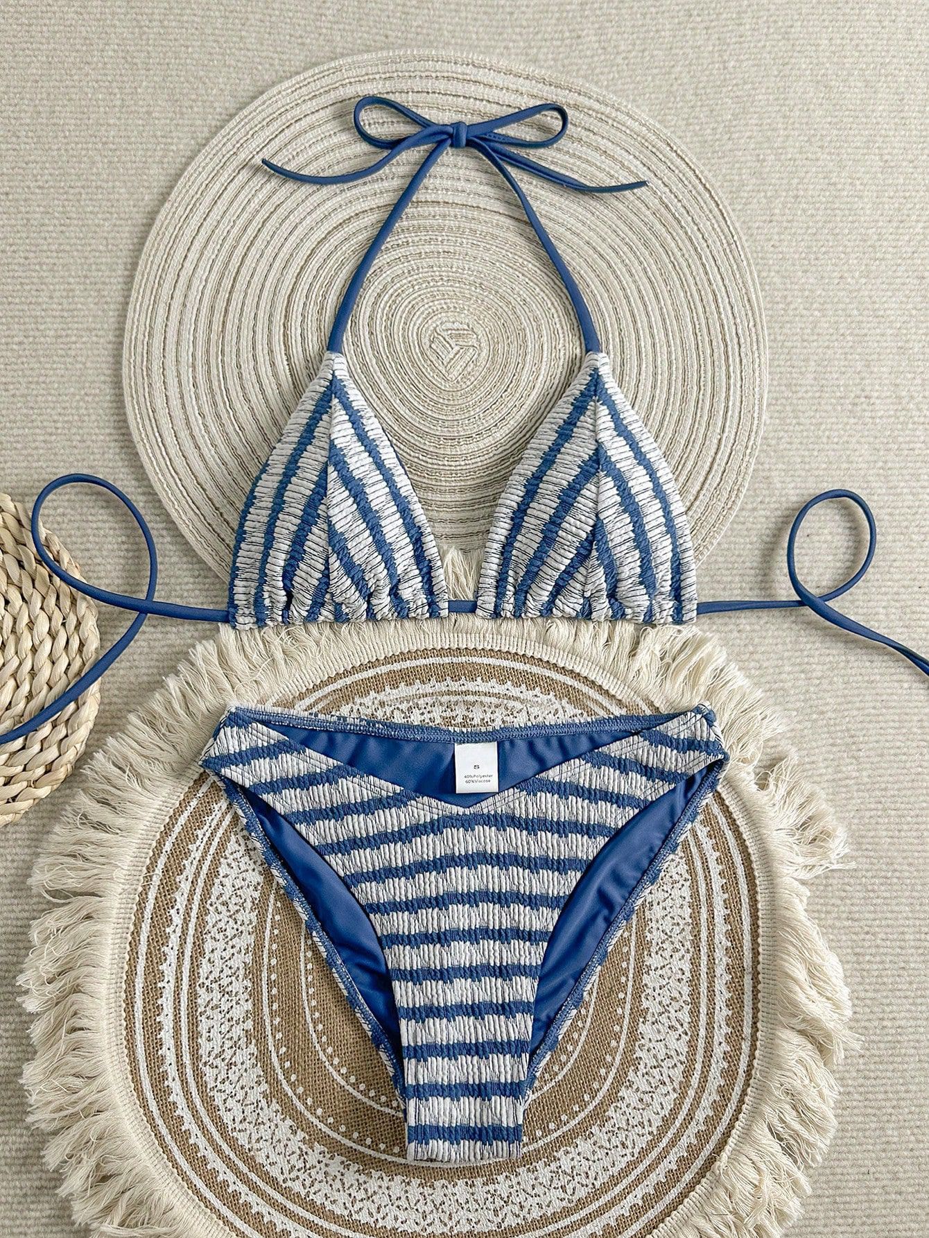 欧美外贸跨境 提花条纹彩色系带分体三点式比基尼泳衣女套装 厂家