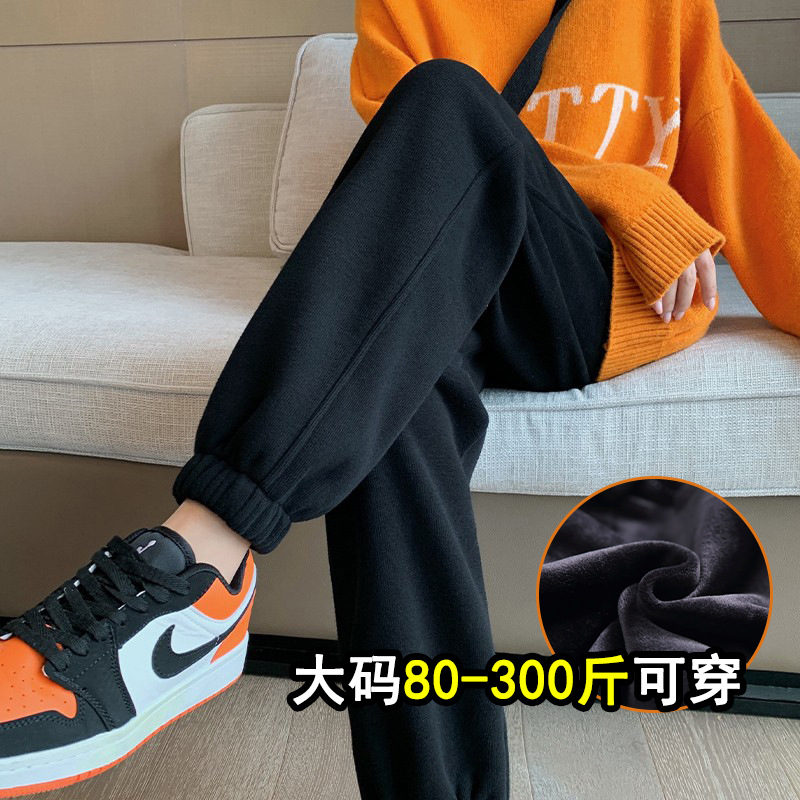 梨形身材大码200斤黑色束脚运动裤女秋冬加绒显瘦胖mm休闲卫裤子