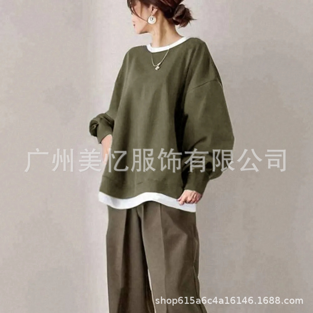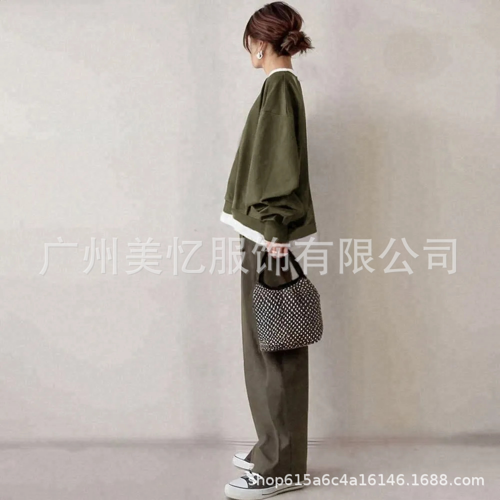 现货2025跨境秋季热卖套装女圆领拼色上衣+休闲裤两件套套装