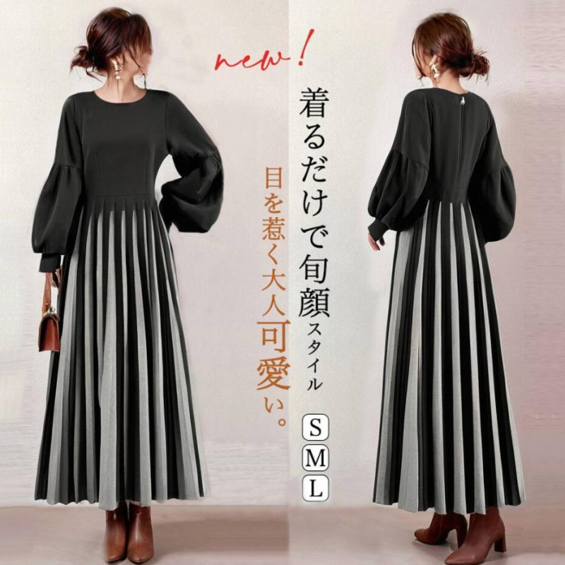 2色展開、2025年春秋人気商品、配色切り替え、ウエストマーク、ボタン付き、プリーツ加工のロングワンピース
