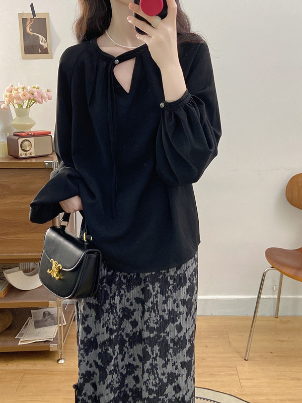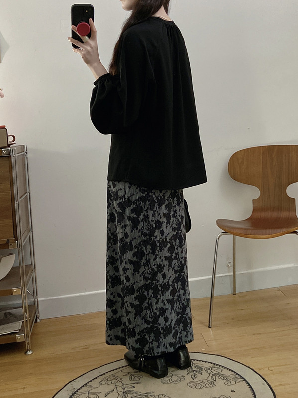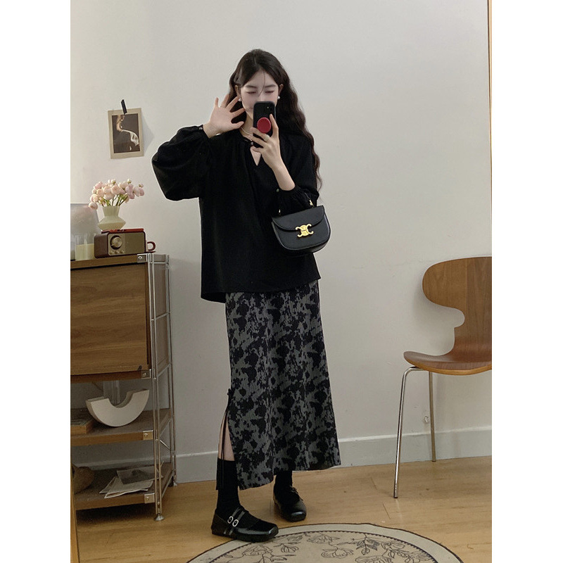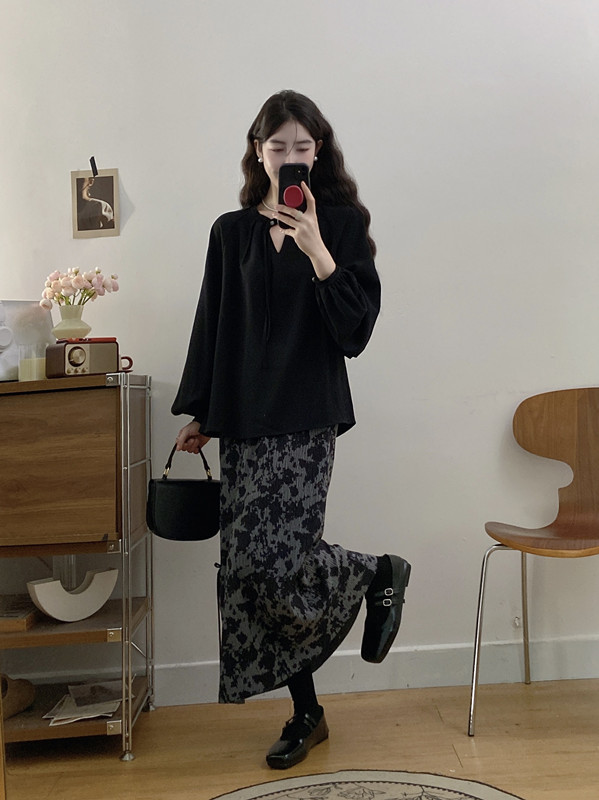 秋季穿搭一整套高级感黑色衬衫高腰直筒半身裙大码女装胖mm两件套