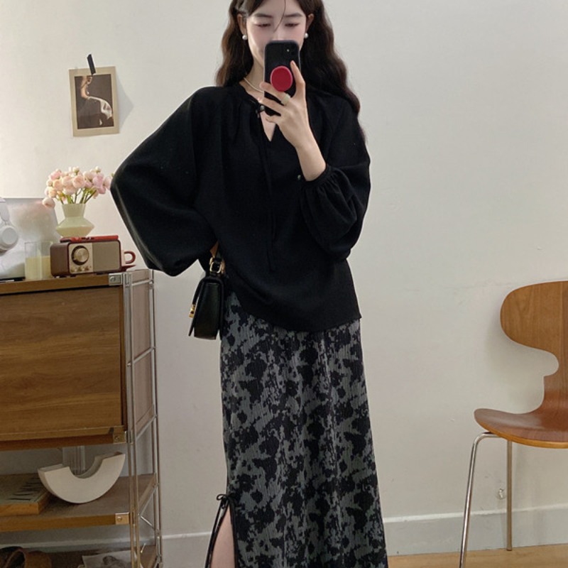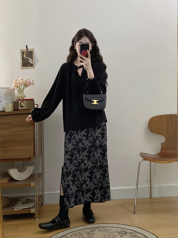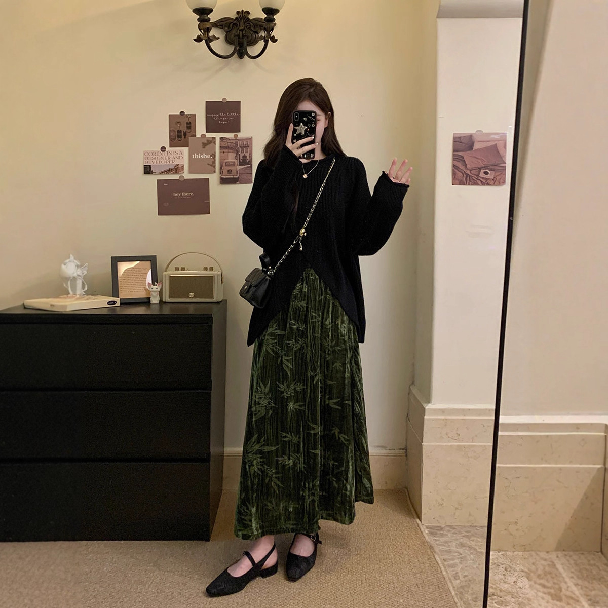 秋冬大码复古百搭设计感毛衣+半高领蕾丝打底衫+长款半身裙三件套